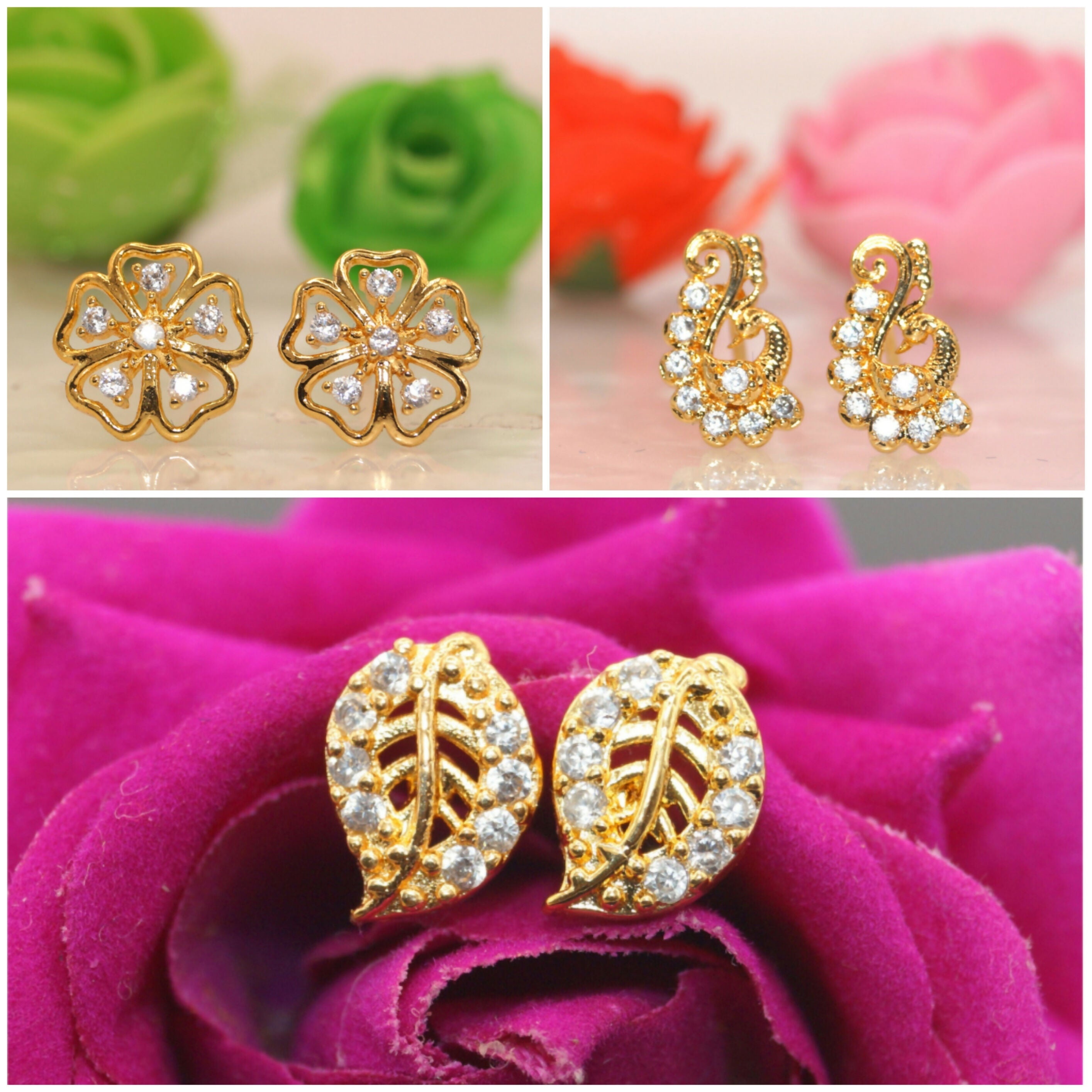 Gold Plated AD Stud Earrings Combo Set of 3 for Women & Girls