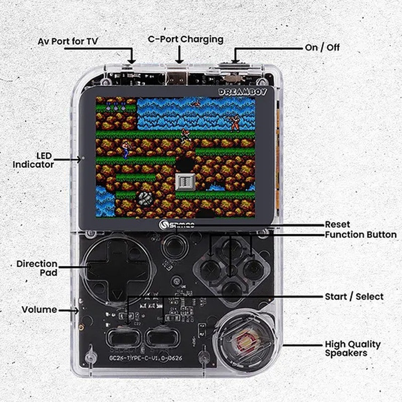 Relive your childhood gaming days with the DreamBoy Retro Handheld Game Console. Packed with 500 built-in classic games, this portable device brings back timeless favorites like Contra, Super Mario, Adventure Island, and more. The console features a clear display screen, responsive control buttons, and a lightweight design that makes it easy to carry anywhere. Equipped with a rechargeable battery, USB charging support, and TV output option, this retro console is perfect for kids and adults who enjoy nostalgic gaming experiences.