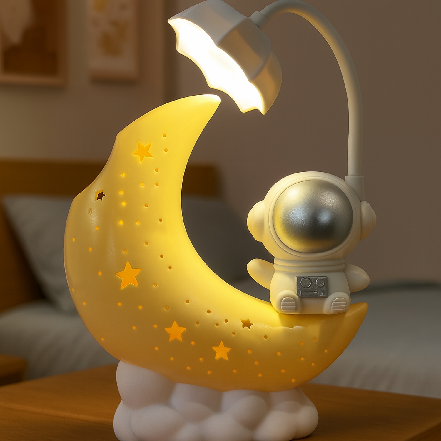 Create a magical bedtime atmosphere with this adorable Astronaut Moon LED Night Lamp. Designed with a glowing crescent moon and a cute astronaut sitting on it, this lamp adds charm, warmth, and imagination to any room. The soft warm yellow light is gentle on the eyes and perfect for night-time use. Ideal for kidsโ bedrooms, nurseries, bedside tables, gifting, and space-themed decor. Its premium finish and stable cloud base make it both decorative and durable.