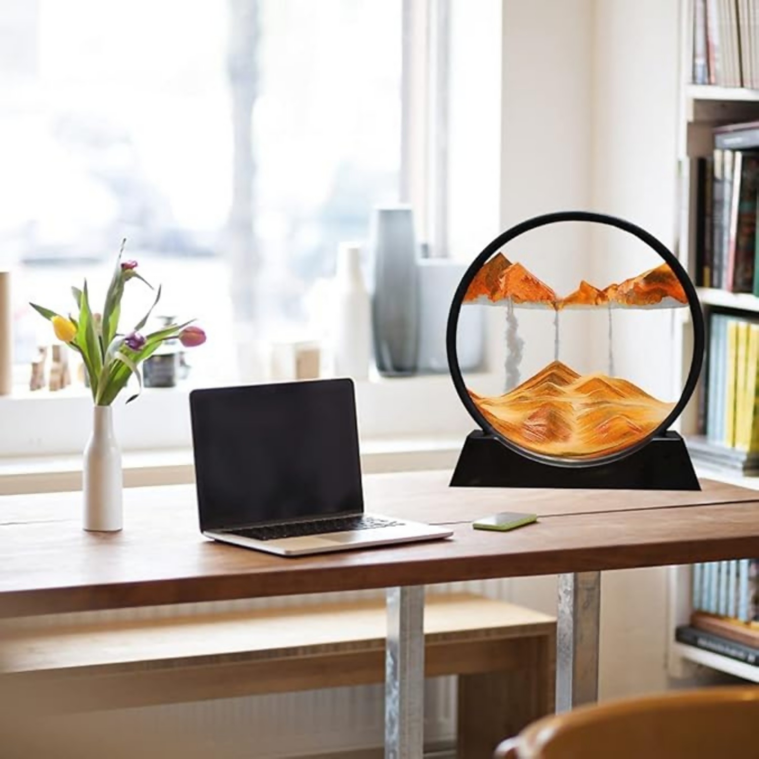Transform any space into a calming visual retreat with this premium rotating moving sand art frame. Designed with an elegant round silhouette and a sturdy black stand, it creates ever-changing landscapes with each flip. The fine, layered sand gently flows to form beautiful dunes, mountain-like patterns, and natural textures—making it both a captivating décor piece and a stress-relief companion.