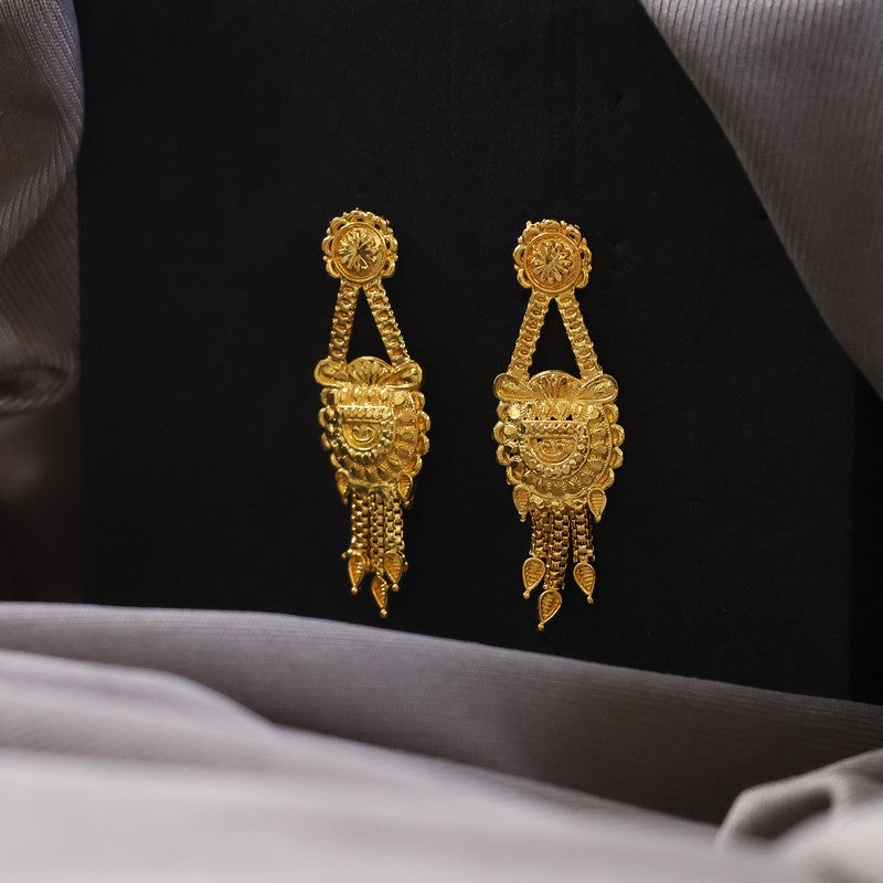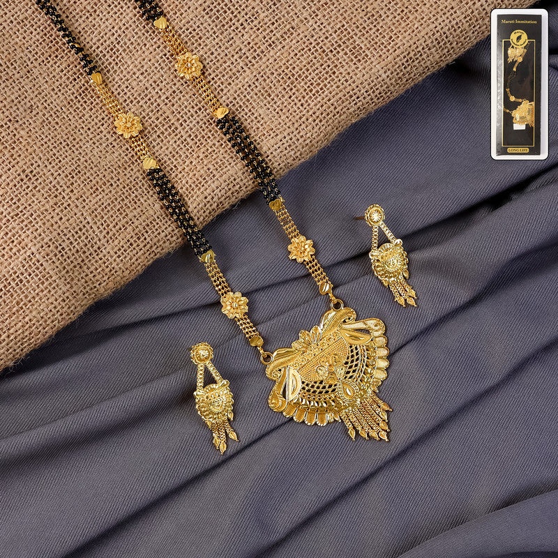 This beautifully crafted mangalsutra set features a striking traditional pendant with intricate detailing that adds richness and elegance to any ethnic outfit. The dual black-bead chain is enhanced with decorative gold elements, giving the design a balanced and graceful appeal. Complemented by matching earrings, this set offers a complete look suitable for festive occasions, cultural events, and everyday traditional wear. Its classic craftsmanship, smooth finish, and timeless styling make it a perfect choice for those who prefer sophisticated and expressive jewellery.