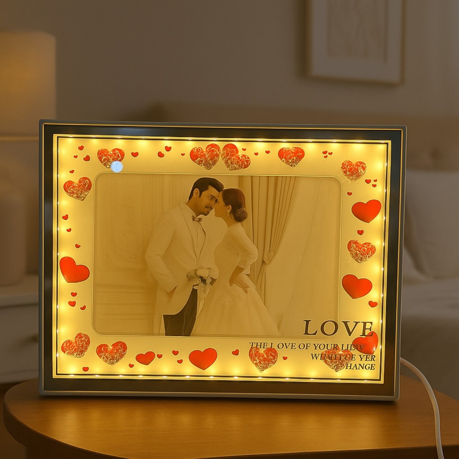 LED photo frame, heart design photo frame, couple gift photo lamp, romantic photo frame light, illuminated 5x7 photo frame, warm light picture frame, anniversary gift for couple, wedding decorative frame, love theme LED frame, USB powered photo lamp, glowing picture frame, bedroom décor light, tabletop LED frame, Valentine couple gift, romantic home décor item