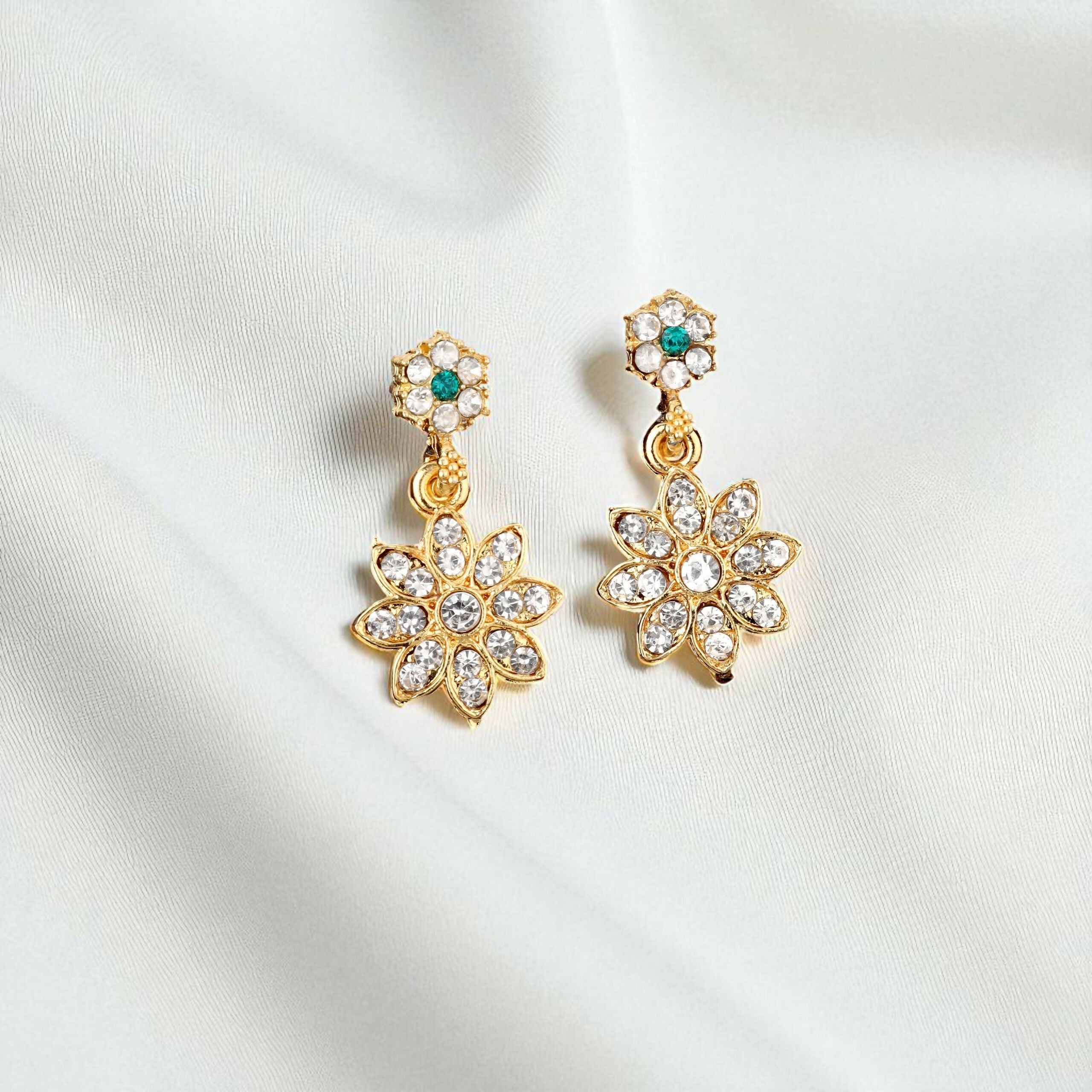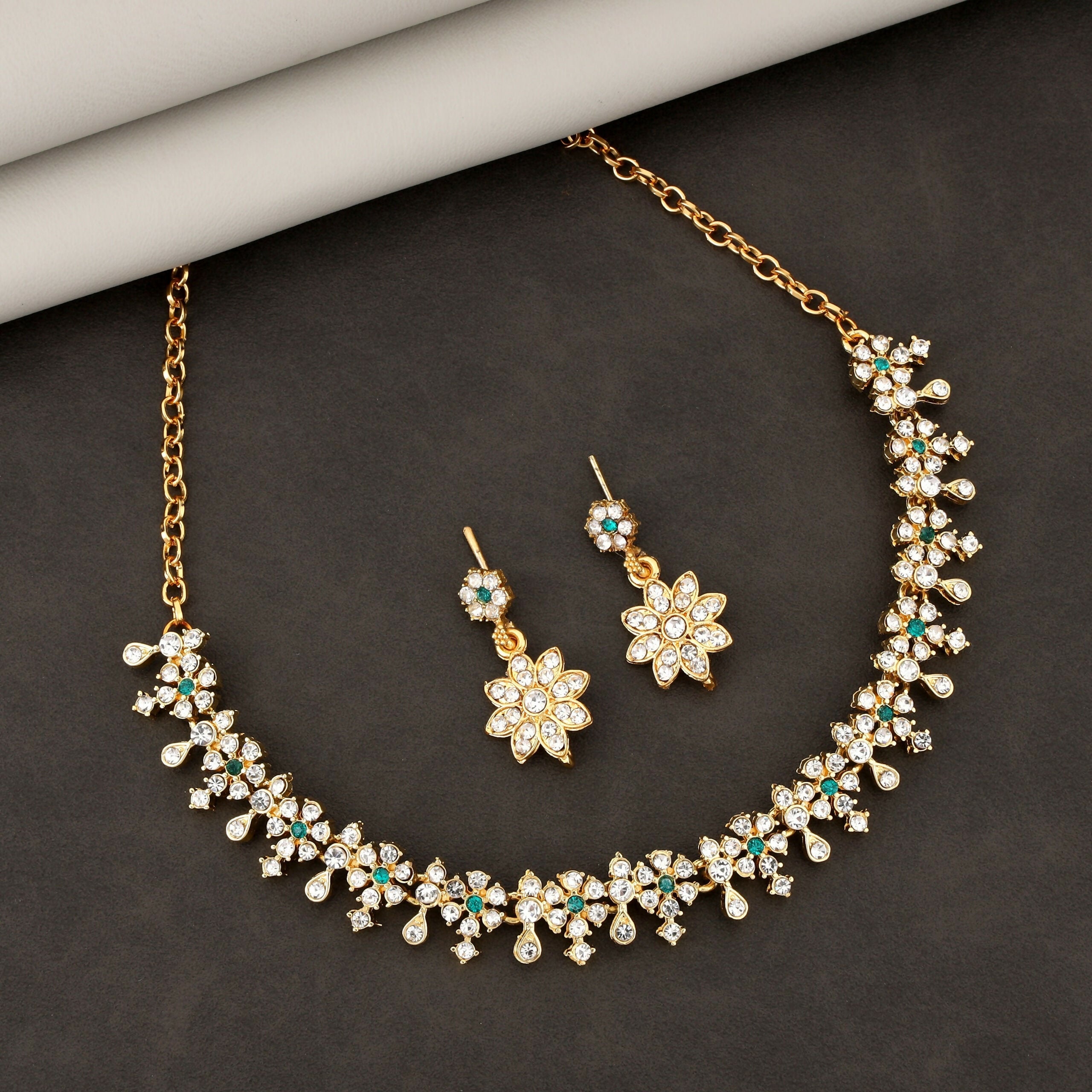 Adorn yourself with this enchanting gold-plated necklace and earring set, featuring a delicate and continuous floral pattern that gracefully highlights the neckline. The design beautifully combines brilliant white crystals with subtle, vibrant emerald green stone accents, creating a captivating sparkle.