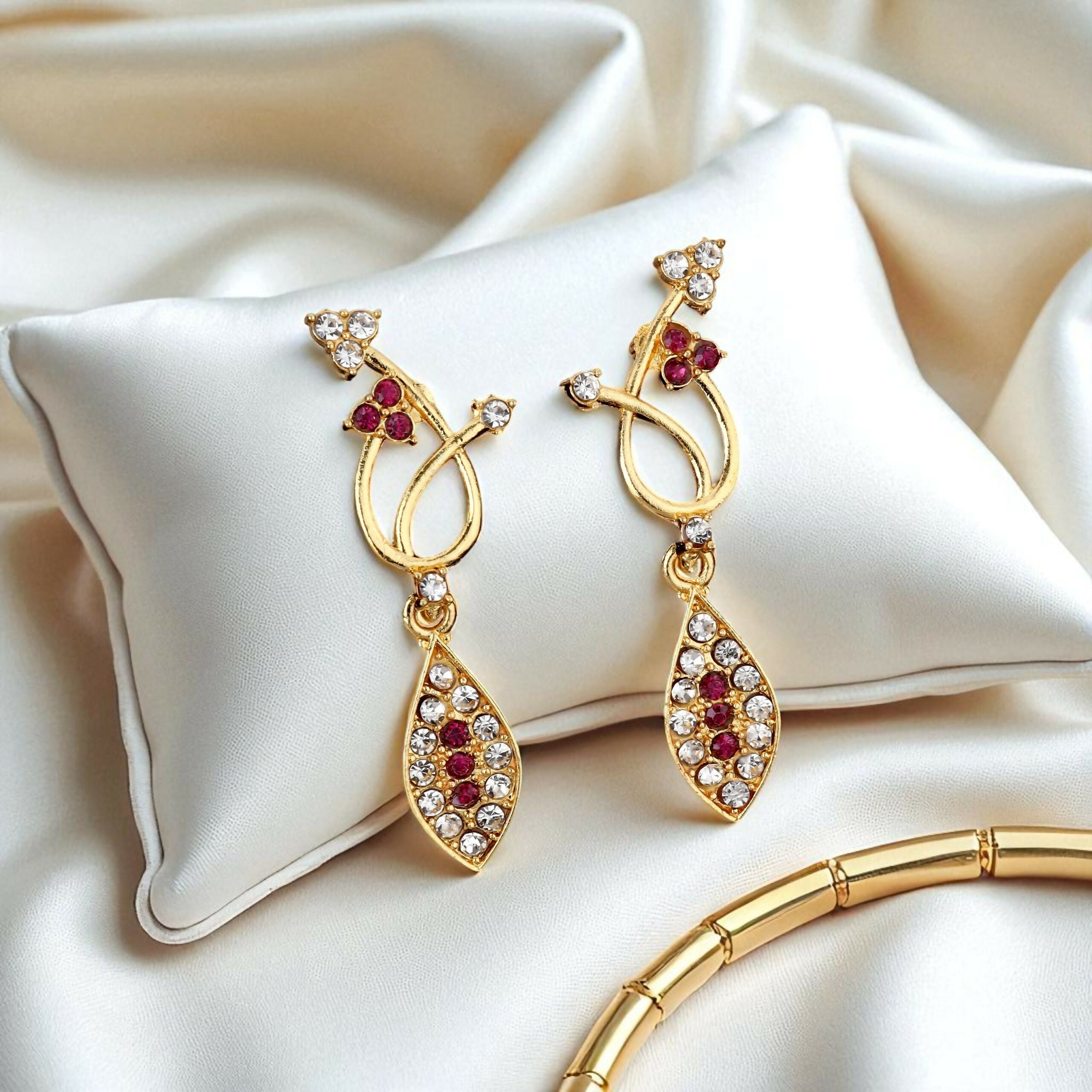 This appealing set features a choker necklace and matching stud earrings with an gold-toned finish. The choker is a continuous band of bold, bezel-set rectangular emerald green simulated gemstones. The bottom edge is accented with small silver-toned daisy or floral motifs, each featuring a tiny green stone. Secured by a traditional pink thread (dori), this set offers a rich, bohemian, or tribal aesthetic, ideal for traditional or Indo-Western outfits.