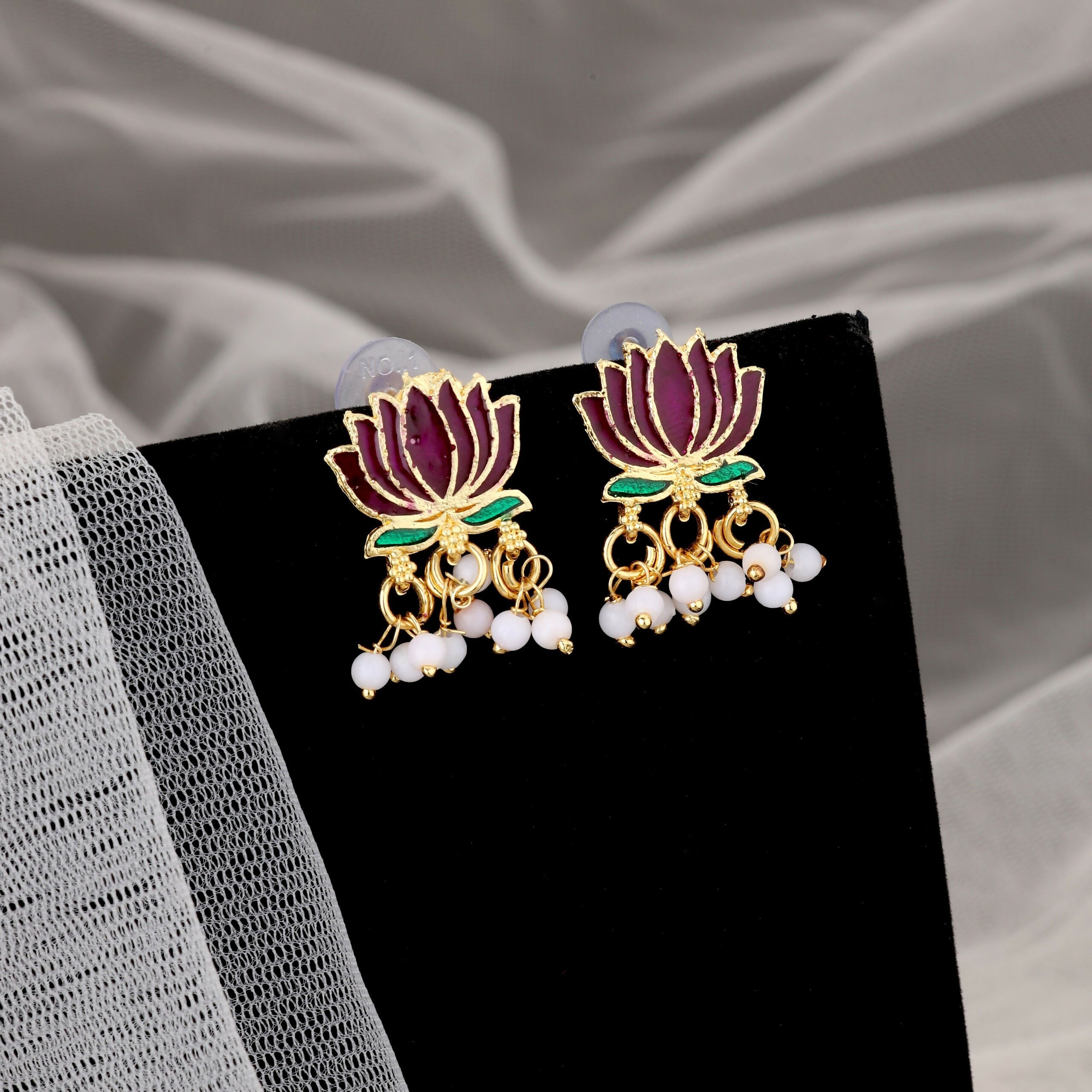 This graceful choker set features a gold-toned necklace and matching bar drop earrings. The necklace is composed of repeating floral clusters, where a large, lustrous white faux pearl (or cabochon) is framed by small, sparkling American Diamonds (AD stones). The design is a continuous, delicate chain of pearl-studded motifs, offering a timeless and classic look secured by a traditional adjustable thread (dori).