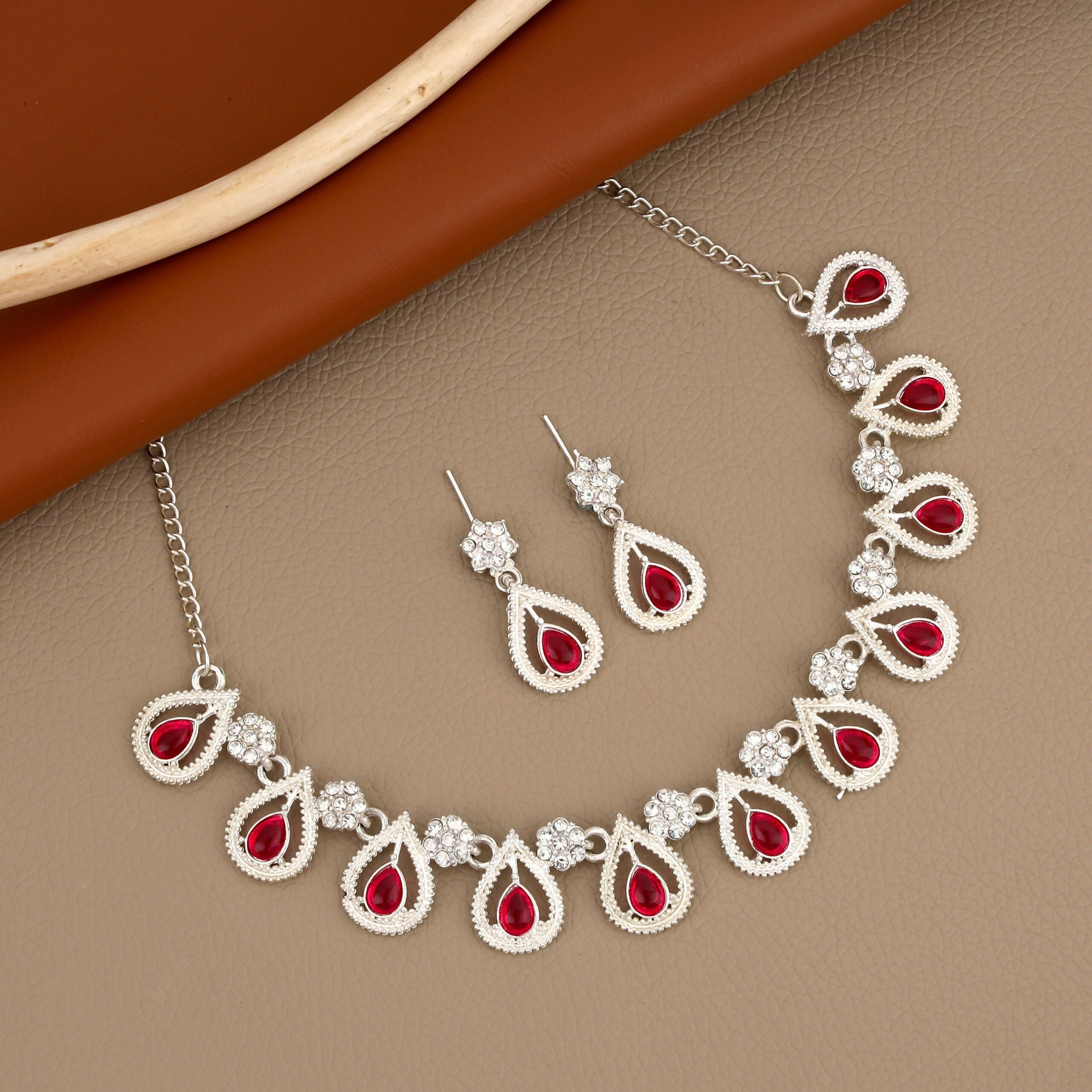 This appealing ethnic set features an oxidized silver-toned necklace and matching drop earrings. The necklace is a continuous band of repeating, scalloped motifs. A round emerald green simulated gemstone is bezel-set in each segment, often surrounded by small clear stones.