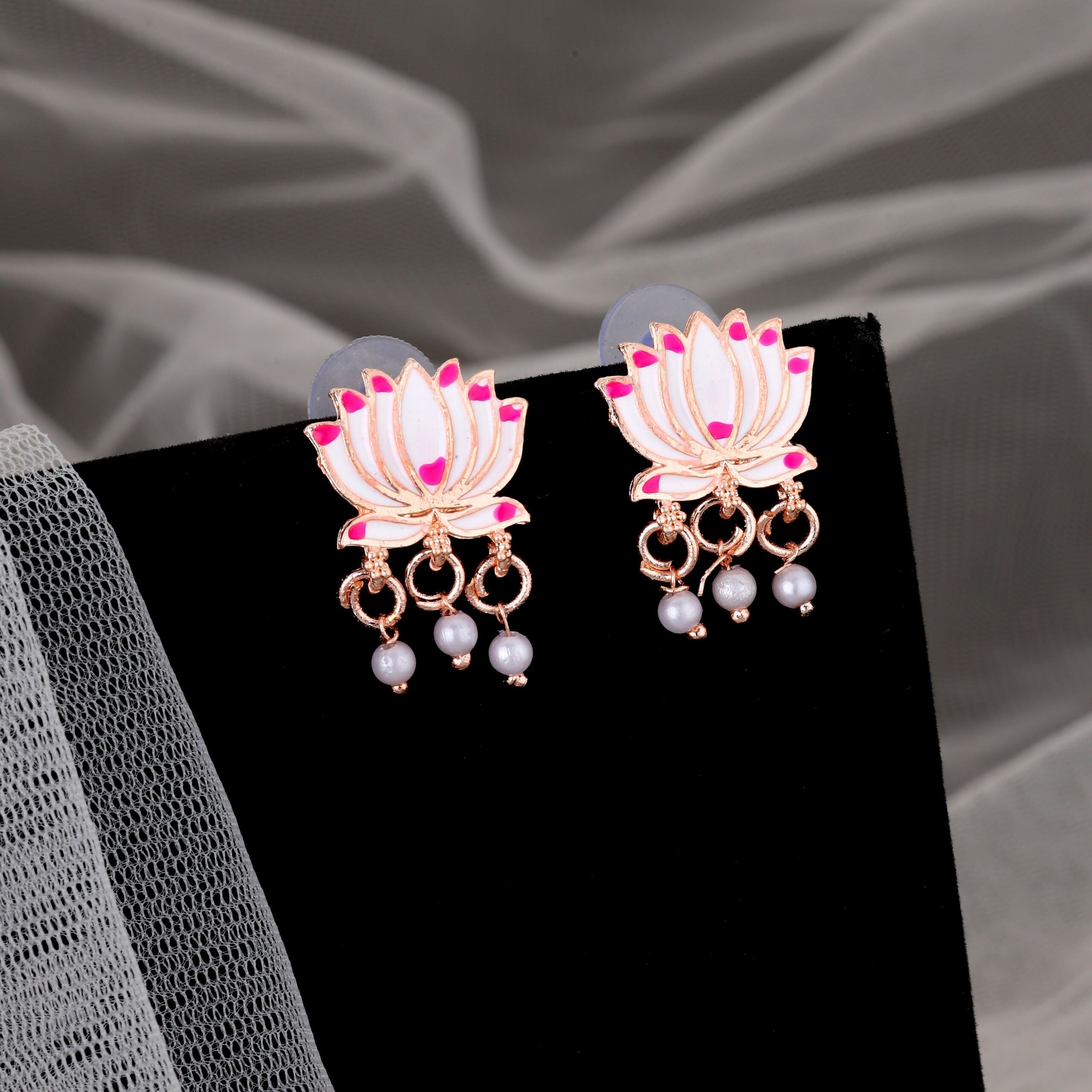 This graceful choker set features a gold-toned necklace and matching bar drop earrings. The necklace is composed of repeating floral motifs, where each segment features a large, lustrous white faux pearl (or cabochon) framed by small, sparkling American Diamonds (AD stones). The design forms a continuous, delicate chain of pearl-studded clusters. It is secured by a traditional adjustable thread (dori), offering a timeless and classic look.