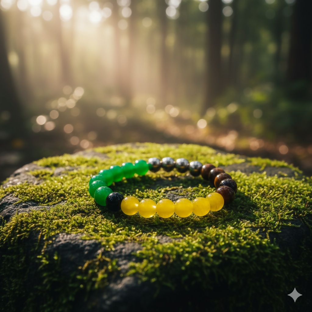 This bracelet features a sophisticated blend of green beads, Tiger’s Eye stones, and yellow crystal beads, each selected for their unique visual appeal and energetic qualities. Tiger’s Eye is renowned for promoting focus and protection, while the green and yellow crystals add vibrant color and positive energy. Strung on a durable elastic cord, the bracelet combines elegance with comfort, making it an excellent choice for those seeking a stylish accessory with both aesthetic and symbolic value.