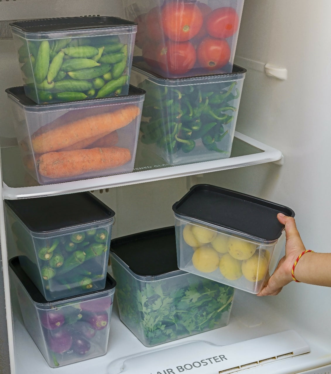 Stackable design saves space and ensures a clutter-free kitchen and refrigerator organization.
