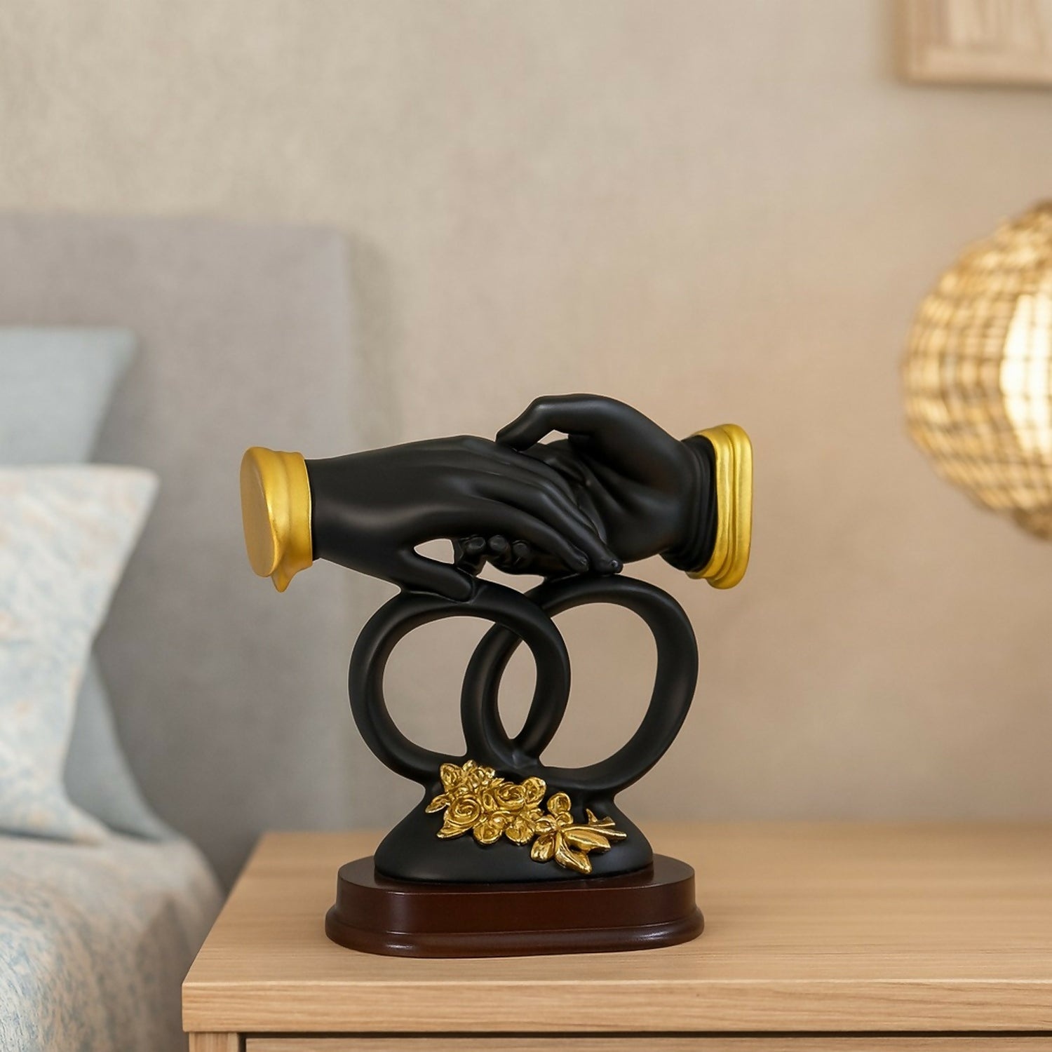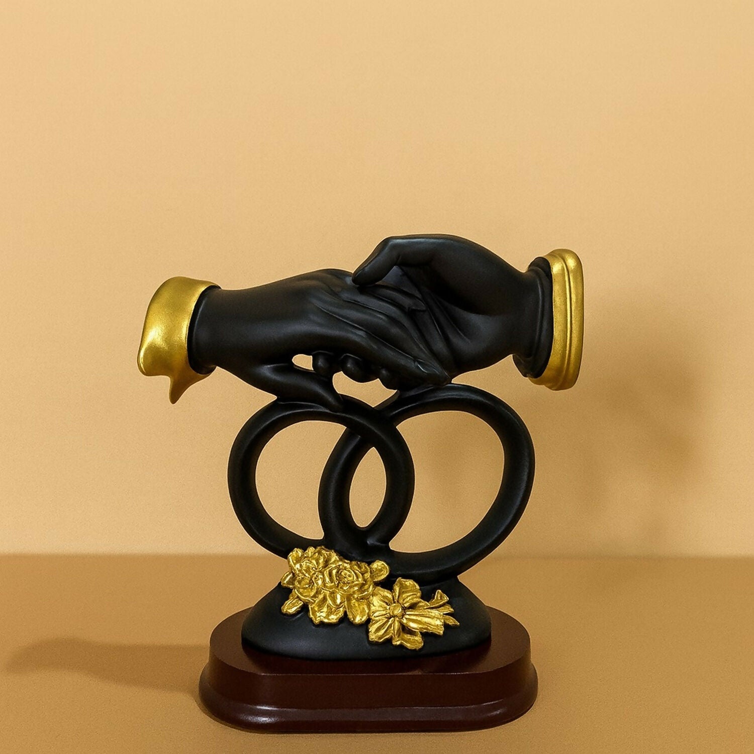 Handshake figurine, couple showpiece, black and gold décor, romantic couple statue, wedding gift for couple, anniversary gift, home décor figurine, resin showpiece, luxury décor statue, modern tabletop décor, love and unity gift, interlocked rings sculpture, bedroom decoration item, office desk accessory.