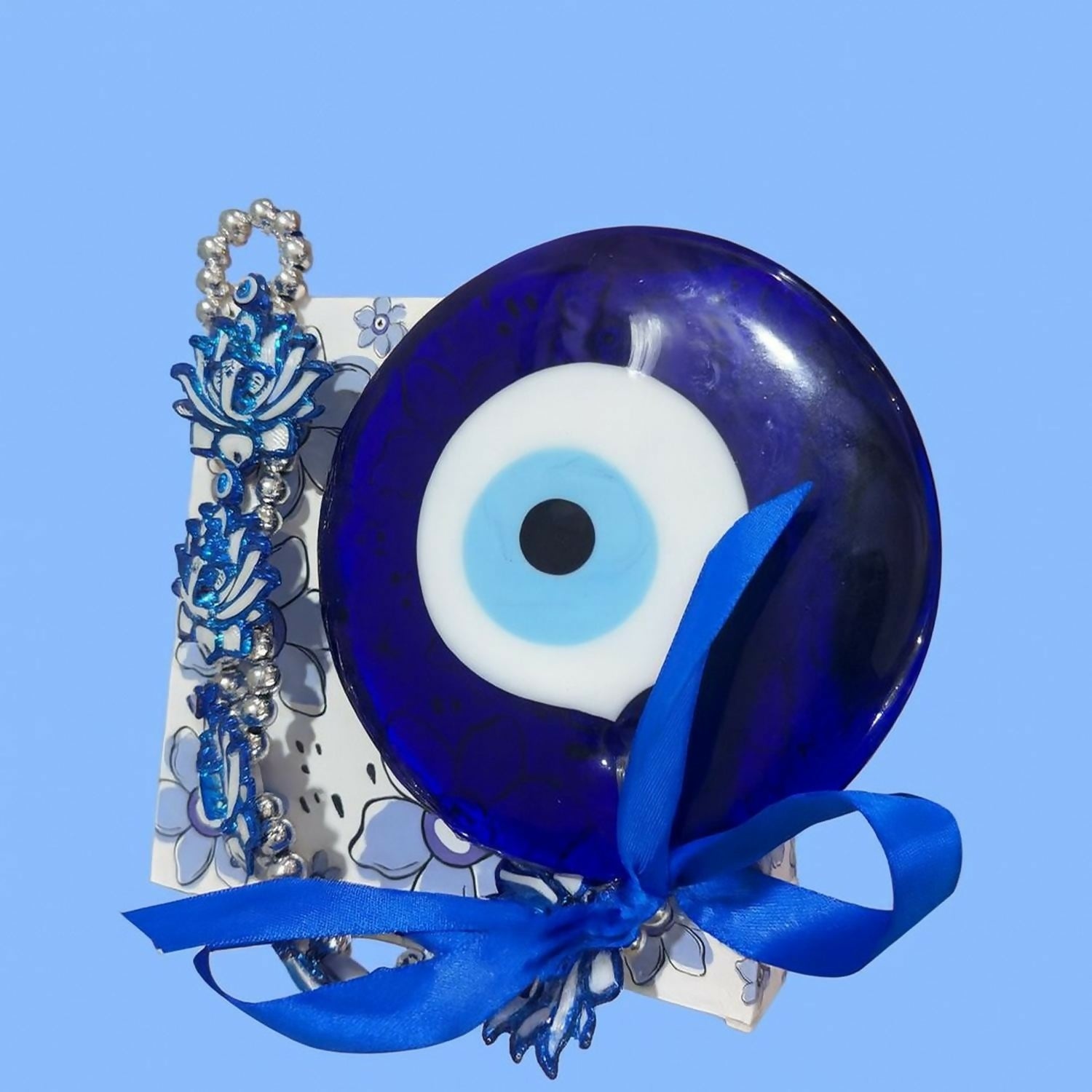 Add a touch of tradition, spirituality, and protection to your space with this beautifully crafted Evil Eye Wall Hanging. Designed with symbolic blue lotus motifs and Om patterns, this decorative piece not only enhances the aesthetics of your home but also serves as a protective charm against negative energies (Nazar Battu). The deep blue Evil Eye centerpiece symbolizes warding off the evil eye, while the elegant ribbon and beads make it suitable for wall décor, door hangings, office entrances, or even car rear-view mirrors. Perfect as a gift for housewarmings, festive occasions, or spiritual celebrations.