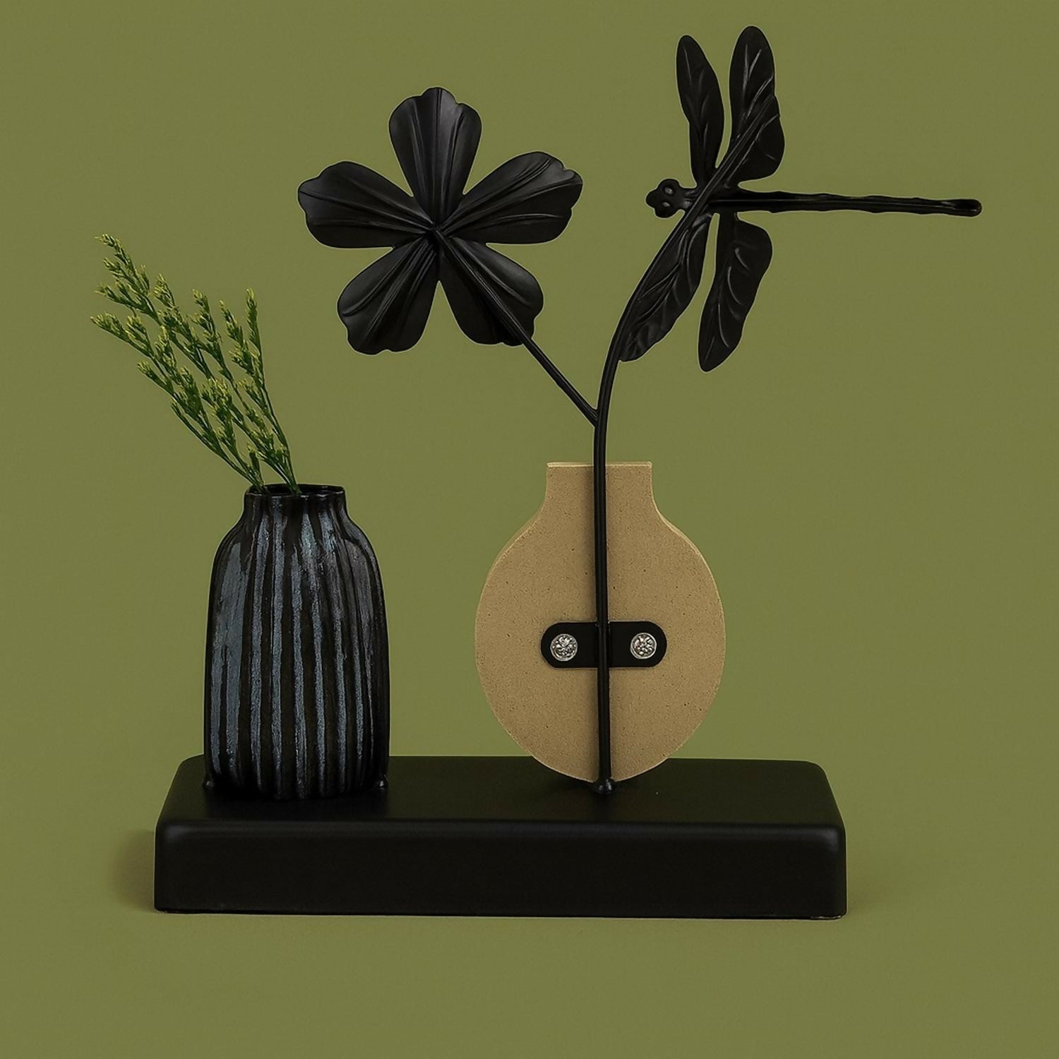Add a touch of artistry to your home with this elegant dragonfly & flower metal showpiece mounted on a sturdy wooden base. The unique combination of a black-gold flower, dragonfly figurine, and striped vase with artificial greenery makes this décor piece stand out. Perfect for enhancing the beauty of your living room, bedroom, office desk, or entryway, it blends natural elegance with modern design.