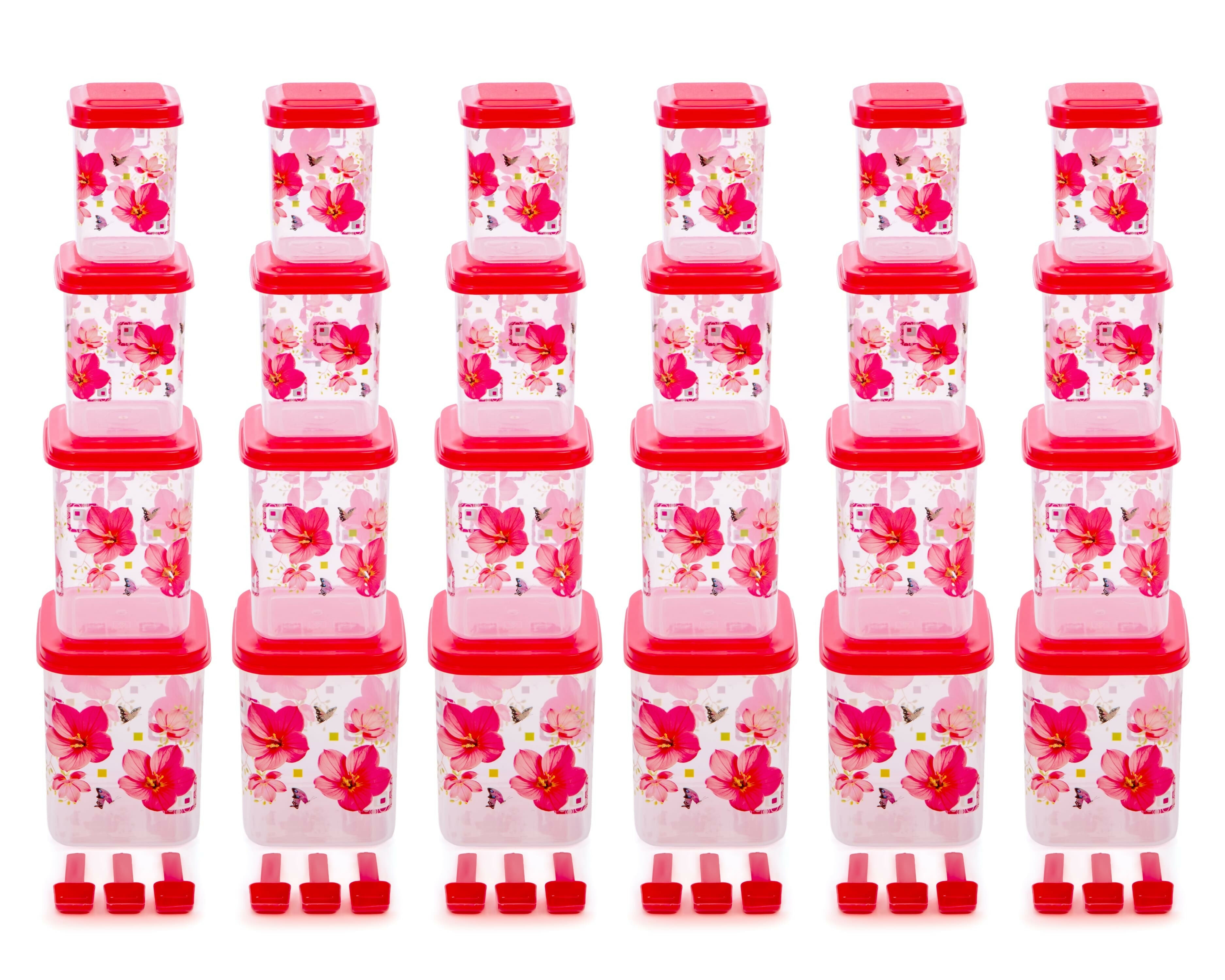 Design: Each container is rectangular with rounded corners and has a vibrant pink and red floral print pattern. The red, airtight lids have a square shape and are designed to snap securely onto the containers.