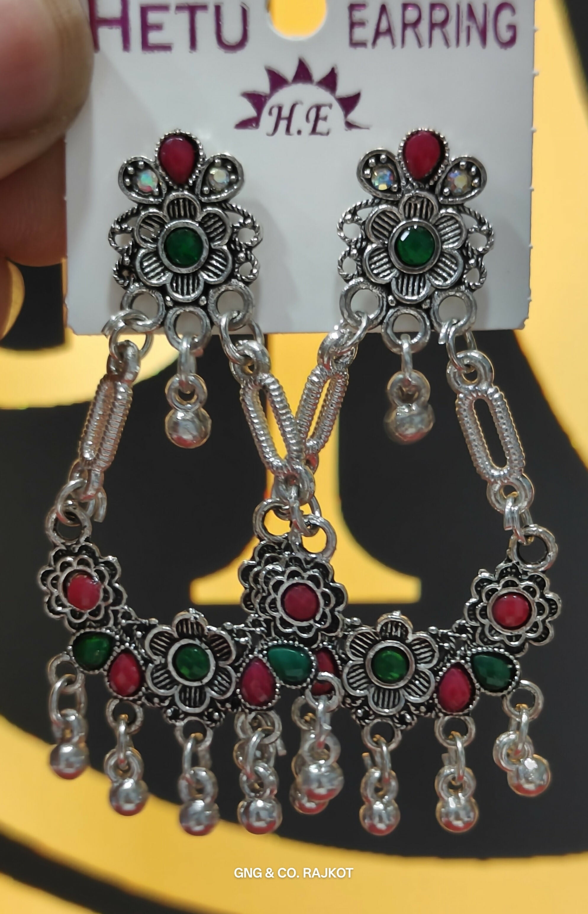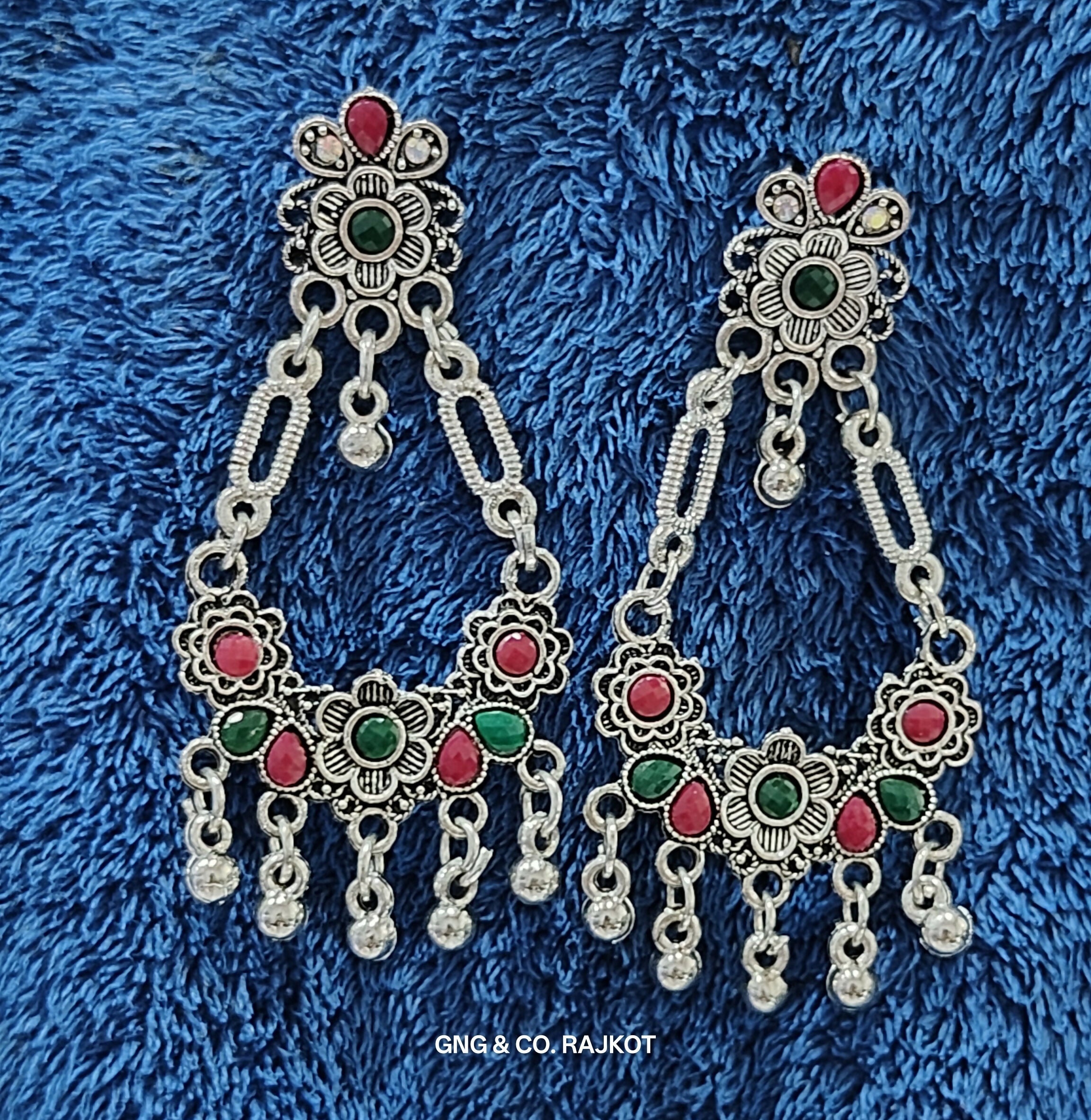 Silver Earings jhumka with green marun beads and stone crafted on it . Perfect design for traditional look.