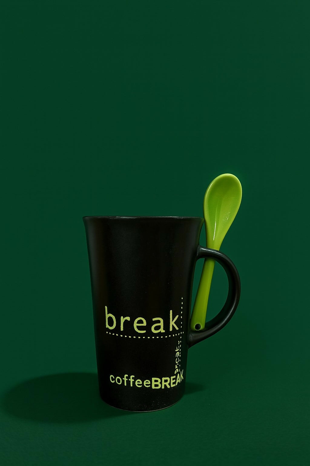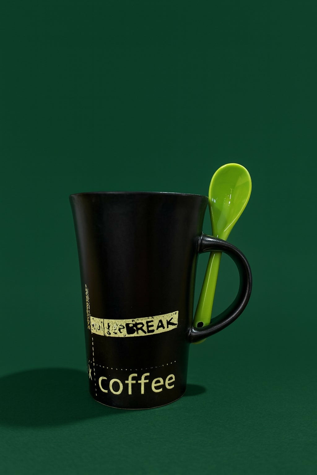Black coffee mug with spoon, ceramic coffee mug, coffee break mug, stylish tea coffee cup, black ceramic mug with green spoon, printed coffee mug, coffee mug for office desk, microwave safe mug, dishwasher safe mug, modern coffee mug, daily use coffee mug, coffee mug gift, ceramic drinkware, coffee tea milk cup, unique coffee mug for men and women.