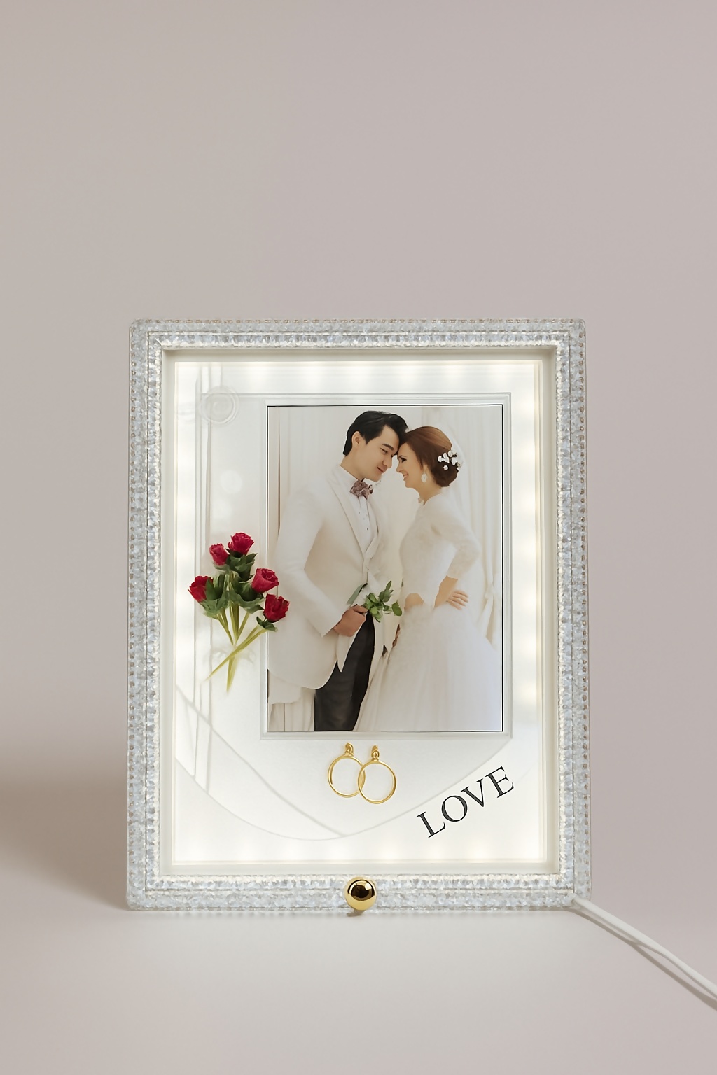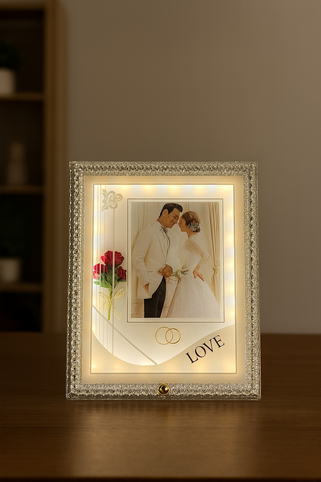 crystal LED wedding photo frame, white illuminated couple frame, 4x6 inch LED photo holder, anniversary gift frame for couples, romantic LED glowing frame, wedding dĆ©cor photo frame, Valentineās Day LED frame, illuminated photo holder with lights, luxury couple photo frame, decorative LED love frame.