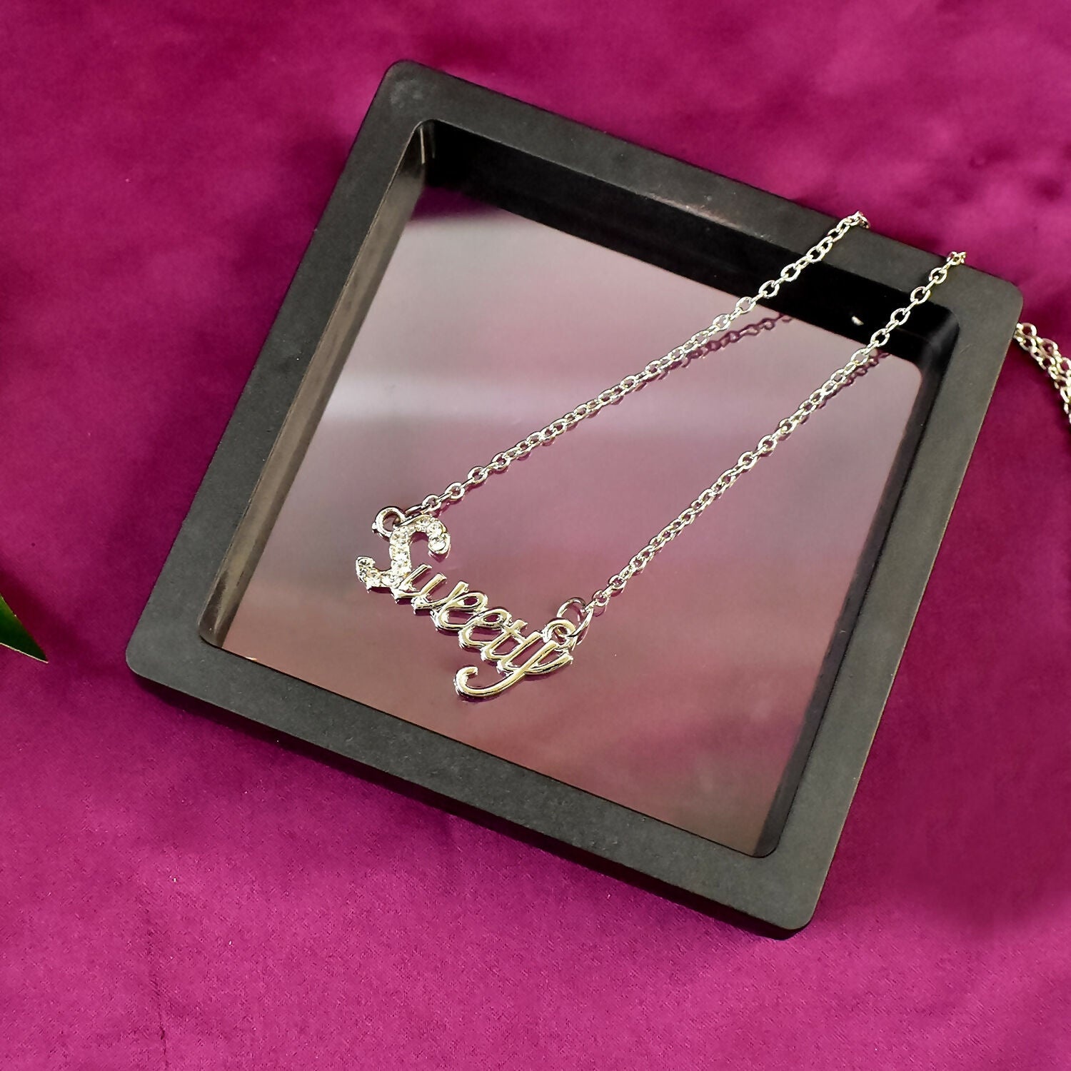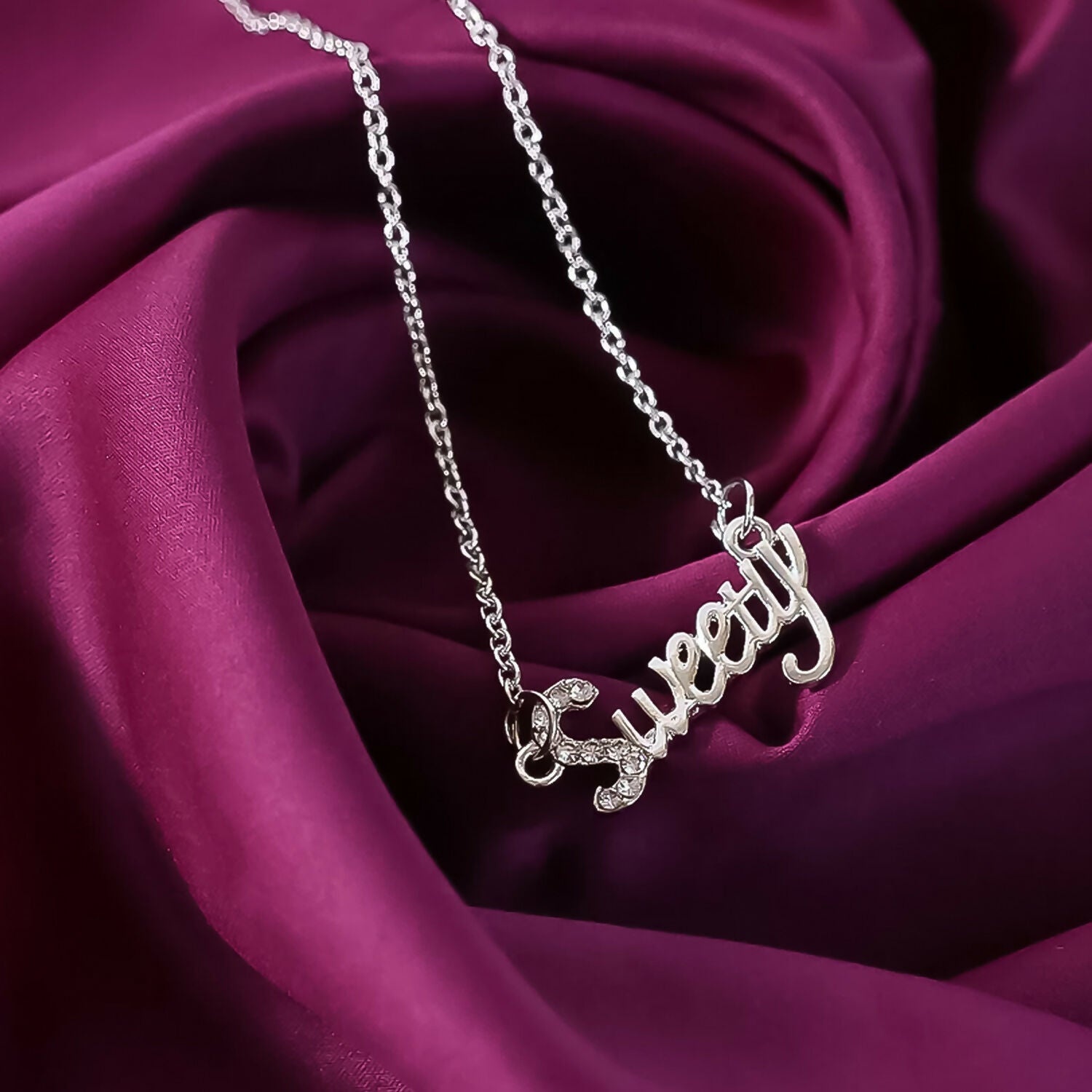 This charming pendant necklace features the word "Sweety" in a stylish script design, adding a personal and affectionate touch to any look. The sleek silver-tone finish gives it a modern yet timeless appeal, while the fine chain ensures comfortable wear. Presented in a premium transparent display case, it’s perfect for gifting or as a special keepsake.