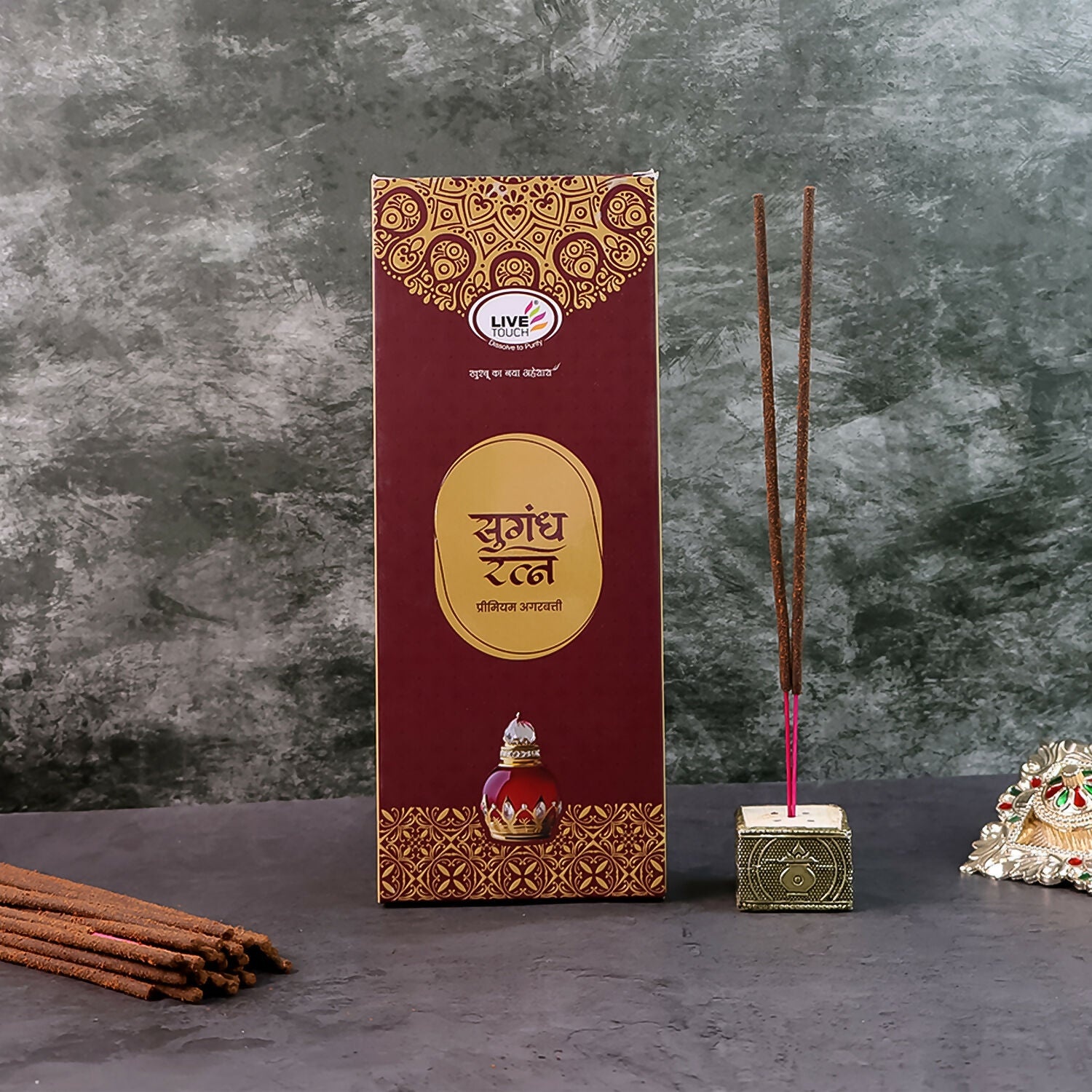 Elevate your spiritual rituals and everyday ambiance with Live Touch Sugandh Ratna Premium Agarbatti. Crafted with a luxurious blend of traditional aromatic ingredients, this premium incense offers a soulful, long-lasting fragrance that soothes the mind and uplifts the environment. Ideal for daily puja, meditation sessions, festive celebrations, or simply refreshing your home, each stick is designed to burn smoothly and evenly, releasing a divine aroma that lingers for hours.