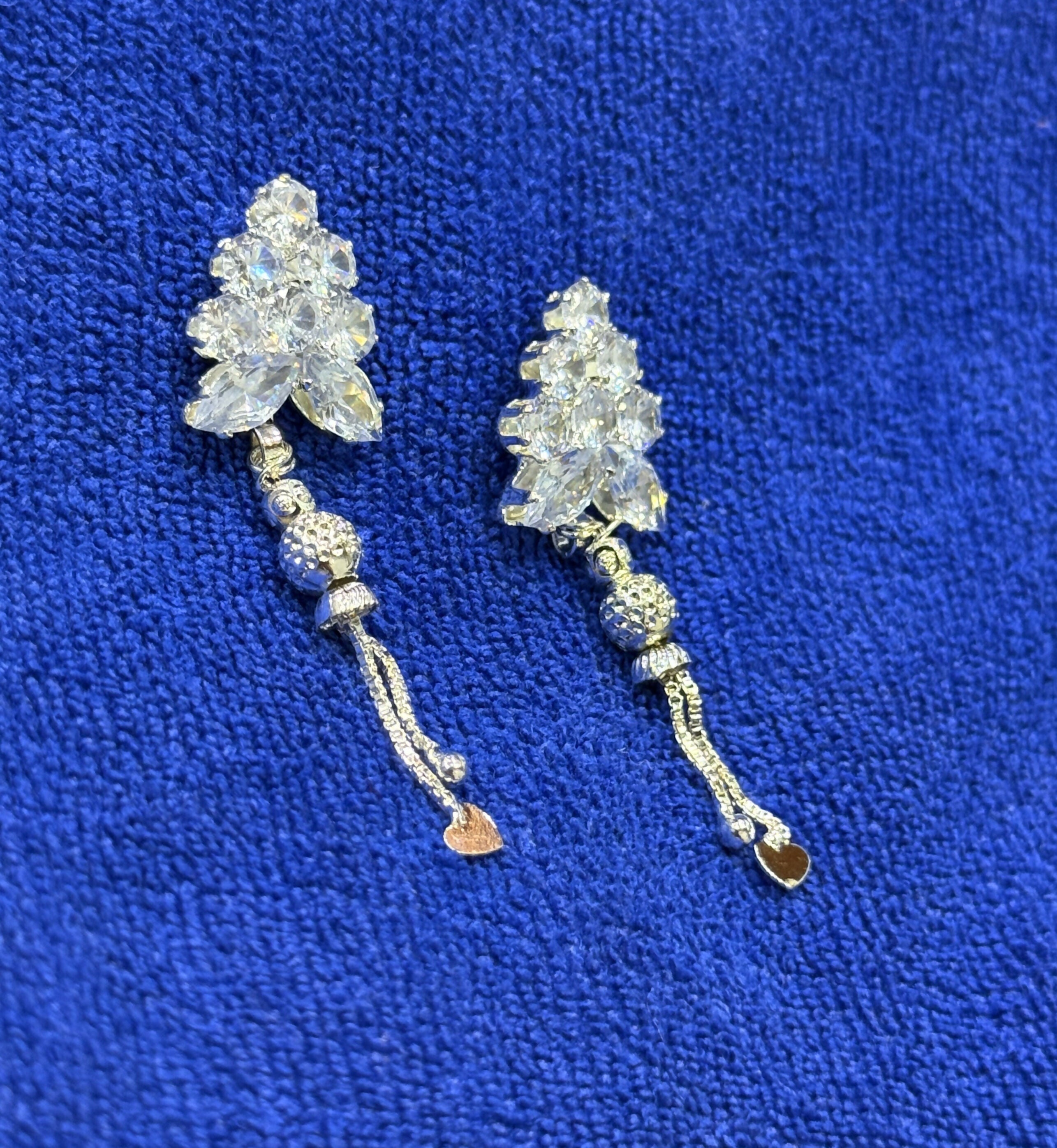 Grace your look with these elegant silver earrings, crafted with a sparkling floral cluster top and finished with a stunning long dangler. The lower part features intricate bead detailing with dual hanging chains, ending in a cute drop and heart charm — a perfect blend of style and grace. These earrings are ideal for modern festive looks and party wear.