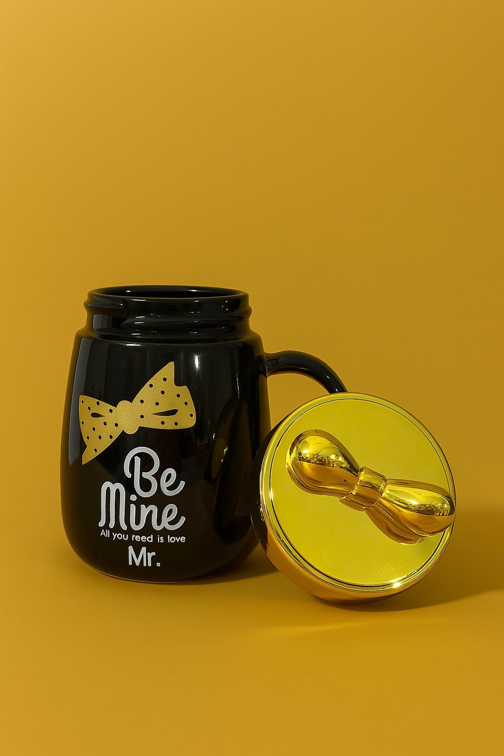 "Be Mine Mr. Black Ceramic Coffee Mug with Golden Lid and Bow Tie