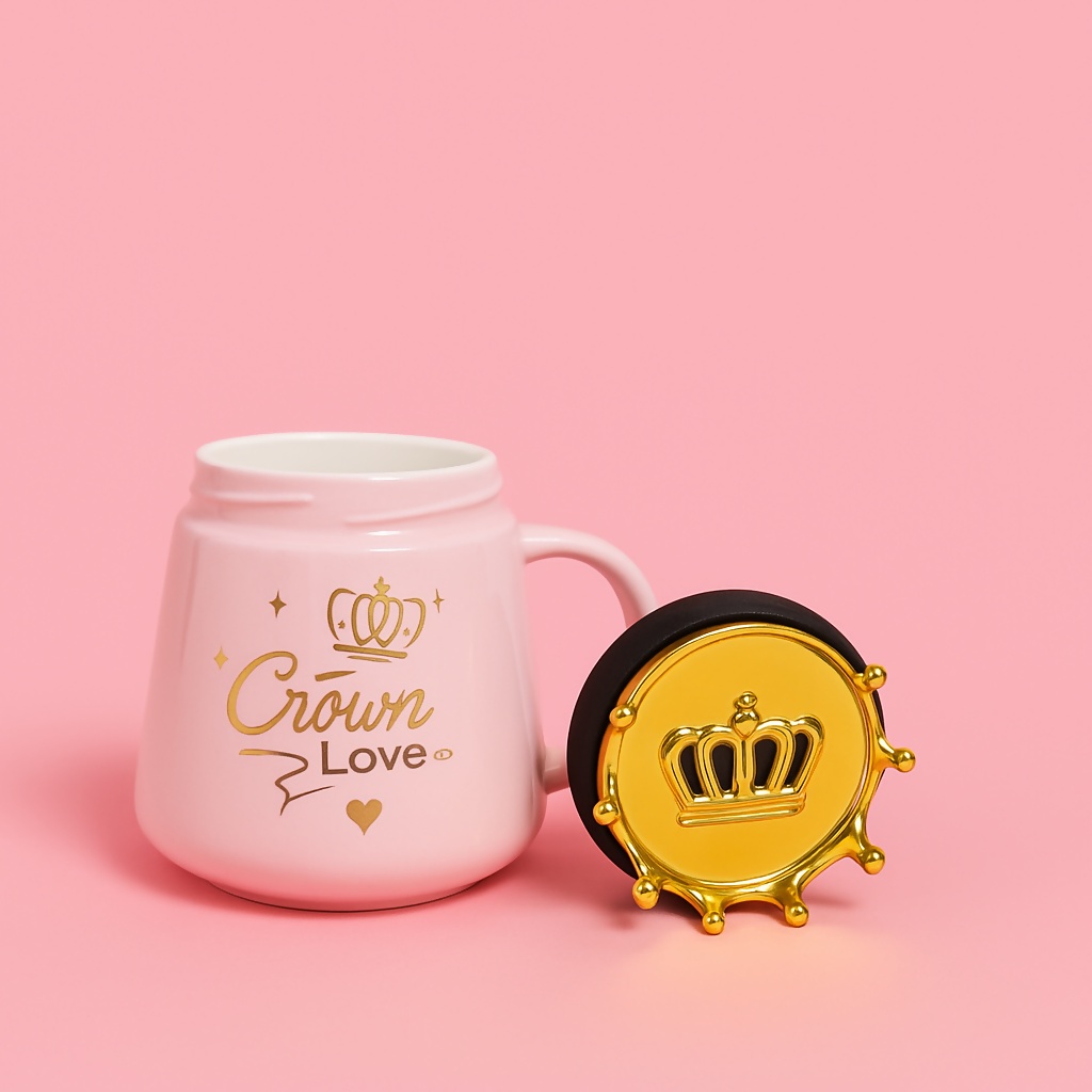 crown love ceramic mug, pink mug for girls, golden crown lid cup, princess coffee mug, cute tea cup for women, ceramic mug with crown top, romantic gift mug, heart and crown printed mug, gift mug for teens, stylish ceramic drinkware, pink and gold tea cup, birthday gift for her