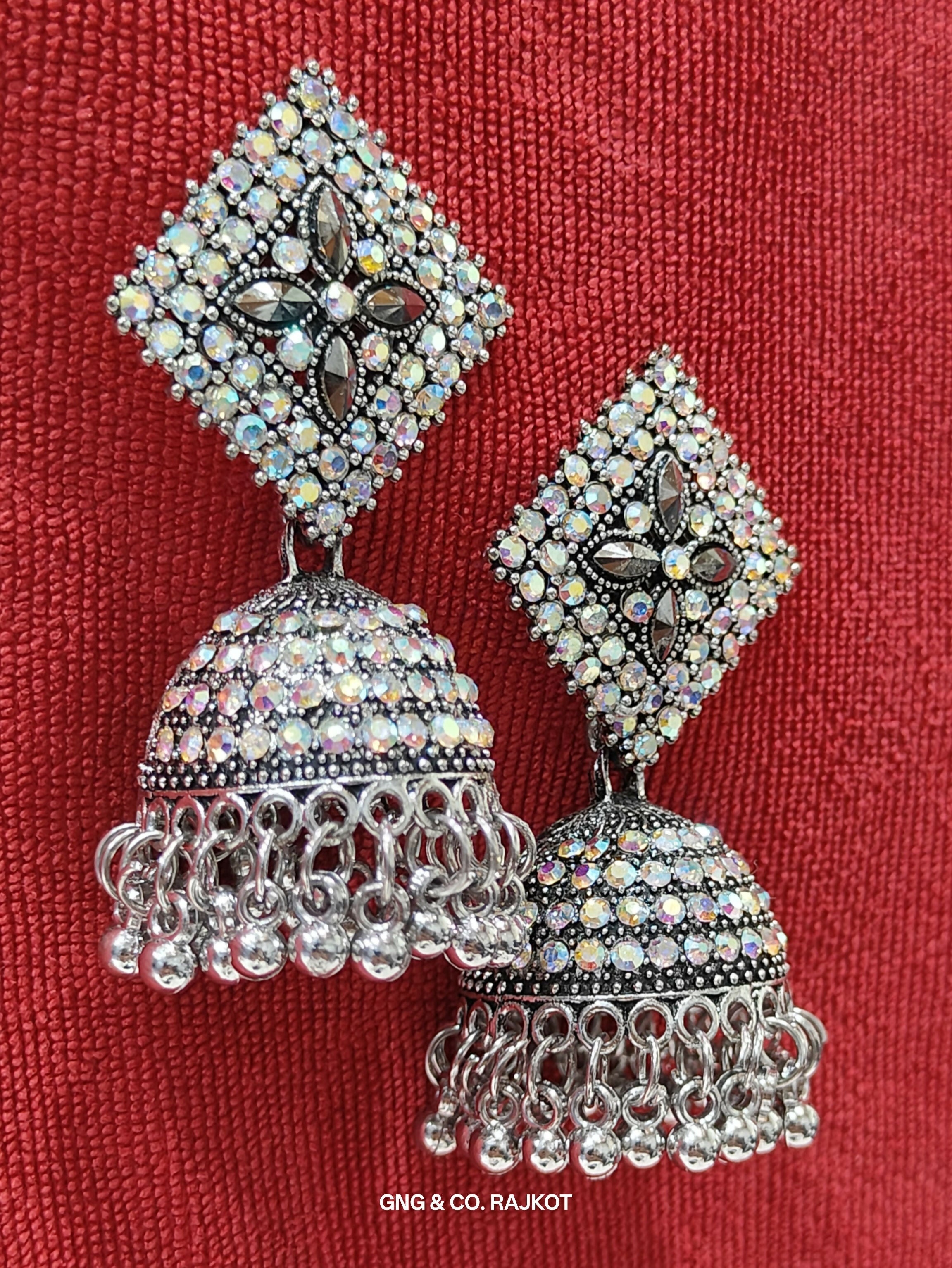 Elevate your elegance with these stunning silver jhumka earrings, featuring a bold square-shaped top completely encrusted with shimmering diamond stones. The dazzling design continues through the entire jhumka, creating a sparkling masterpiece that captures the light from every angle. Crafted for those who love luxury and timeless beauty, these earrings are perfect for weddings, parties, or festive occasions. A true blend of tradition and modern glamour.