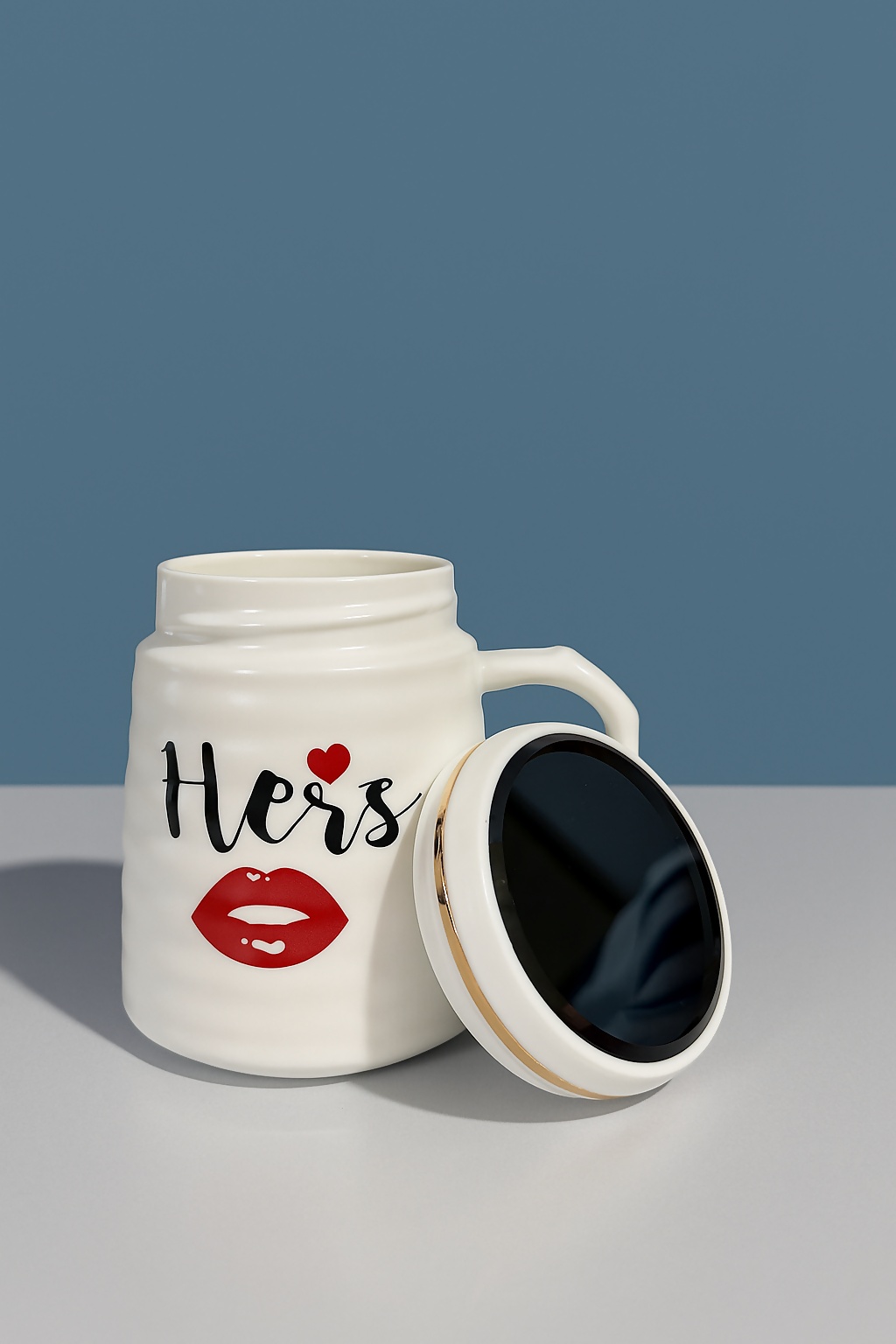 Cute White Ceramic "Hers" Mug with Red Lip Print and Lid