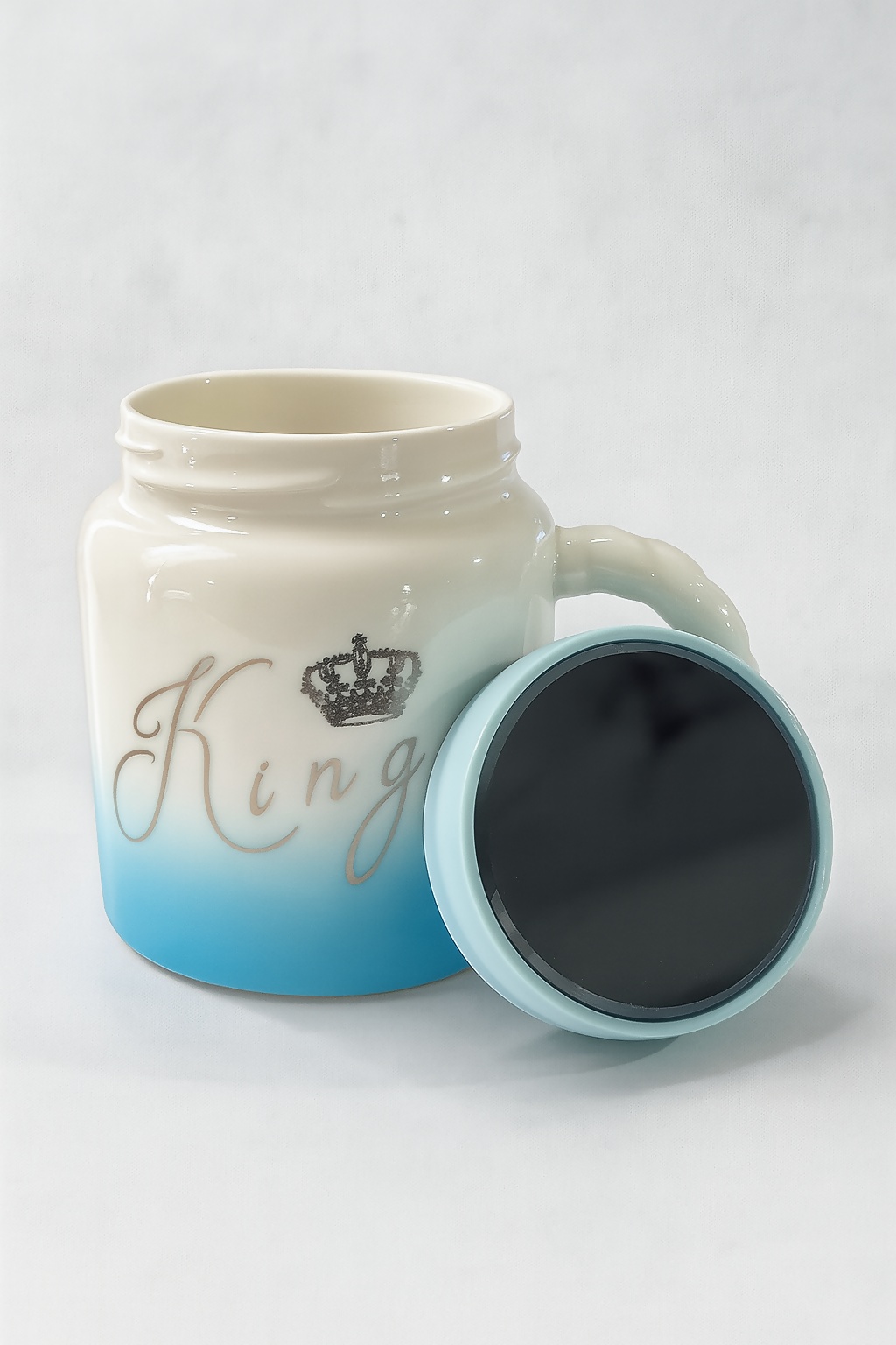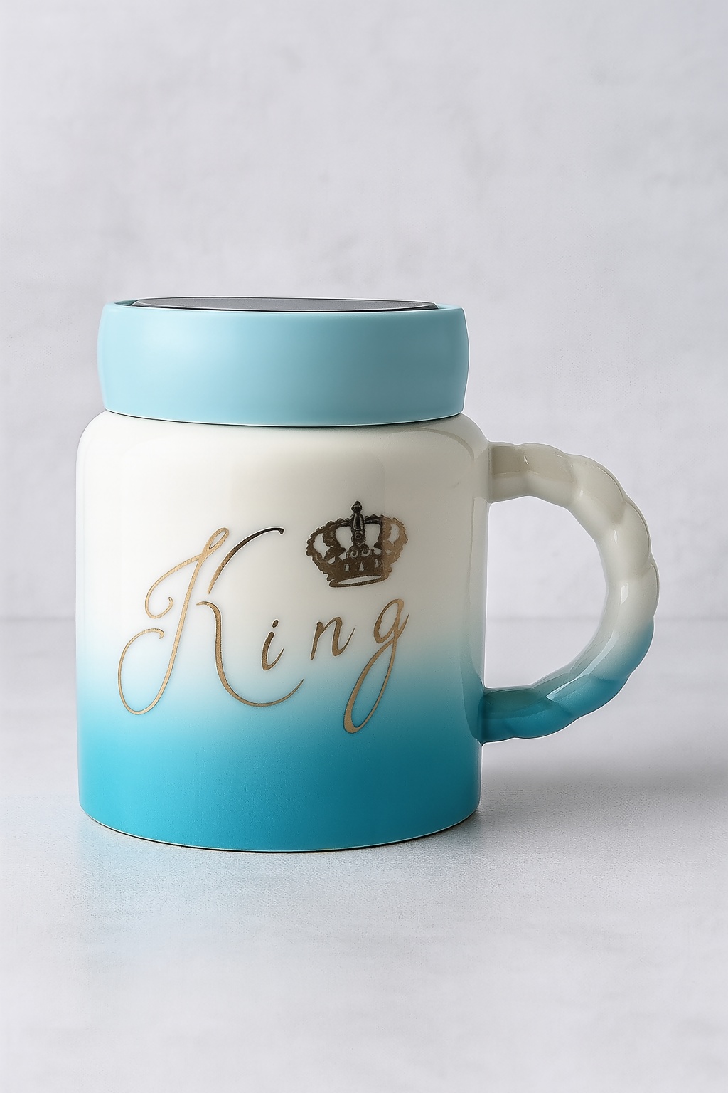 Enjoy your favorite beverage in style with this premium Ceramic King Mug. Featuring a bold “King” inscription with a regal crown emblem, this mug is crafted for those who enjoy a royal touch in their everyday routine. Designed with a unique gradient blend from white to sky blue and a glossy finish, this mug is more than just functional—it's a statement piece. The mug comes with a matching ceramic lid that doubles as a coaster and helps retain warmth, while the twisted handle ensures a firm and comfortable grip. Ideal for gifting on birthdays, anniversaries, Father’s Day, Valentine’s Day, or simply to treat yourself like royalty.