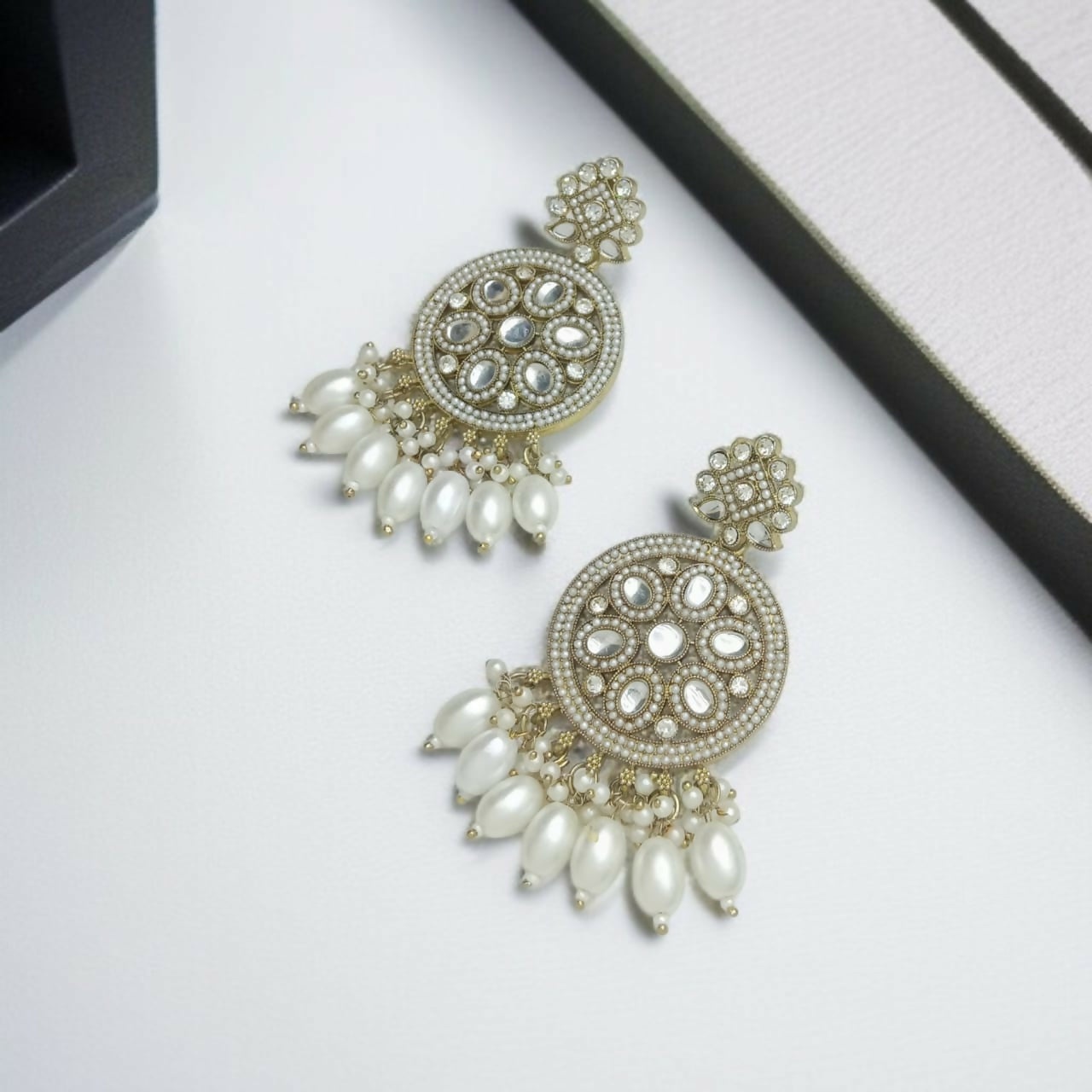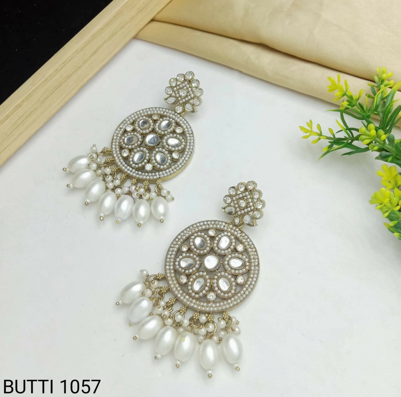 Gold-Finish Circular Buttis with White Kundan & Pearl Drops