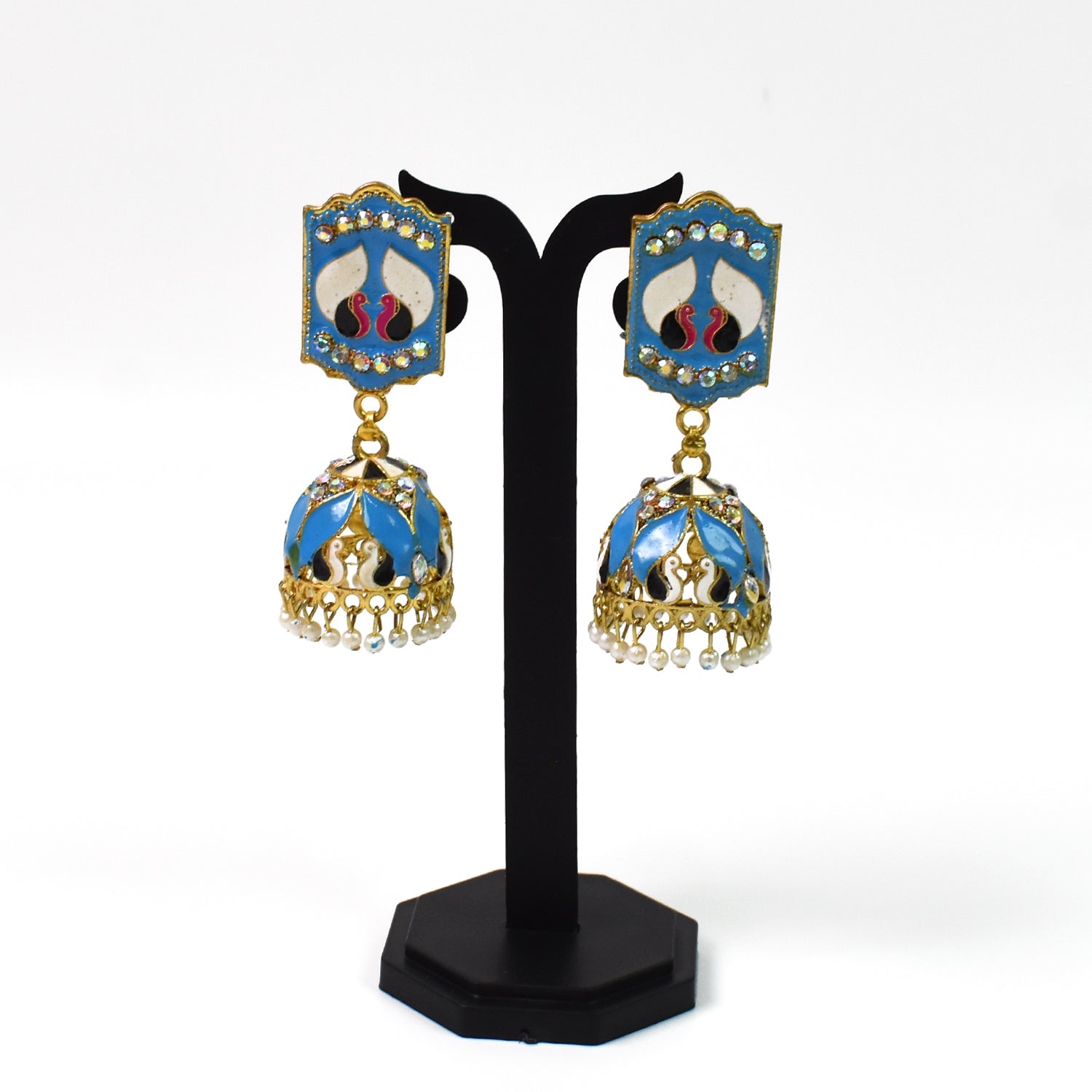 - Featuring a bold blue hue paired with intricate detailing, these earrings offer a modern twist on the classic jumka style.
