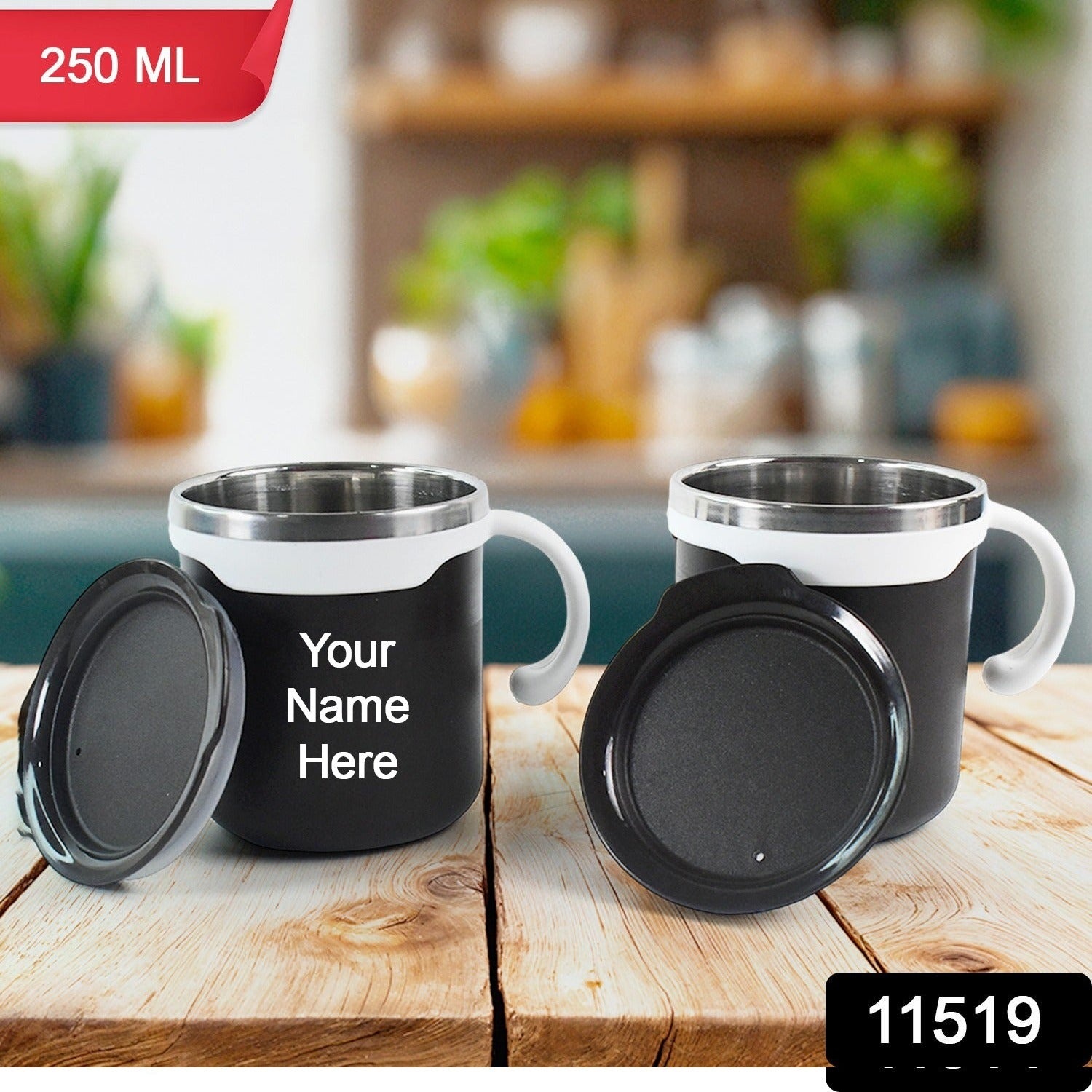 2 Pcs Premium Mocha Mug Set – 250 ml Each – Stainless Steel Interior with Black Matte Exterior and White Handle – Leak-Proof Lid – Stylish Hot Beverage Cups for Home, Office & Gifting