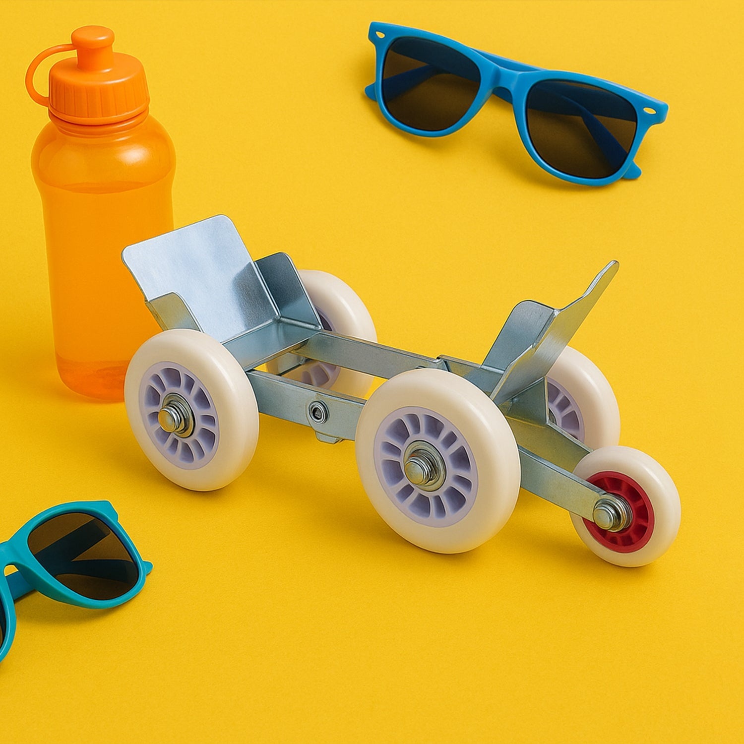 Five-wheel design: one small for steering and four large for support