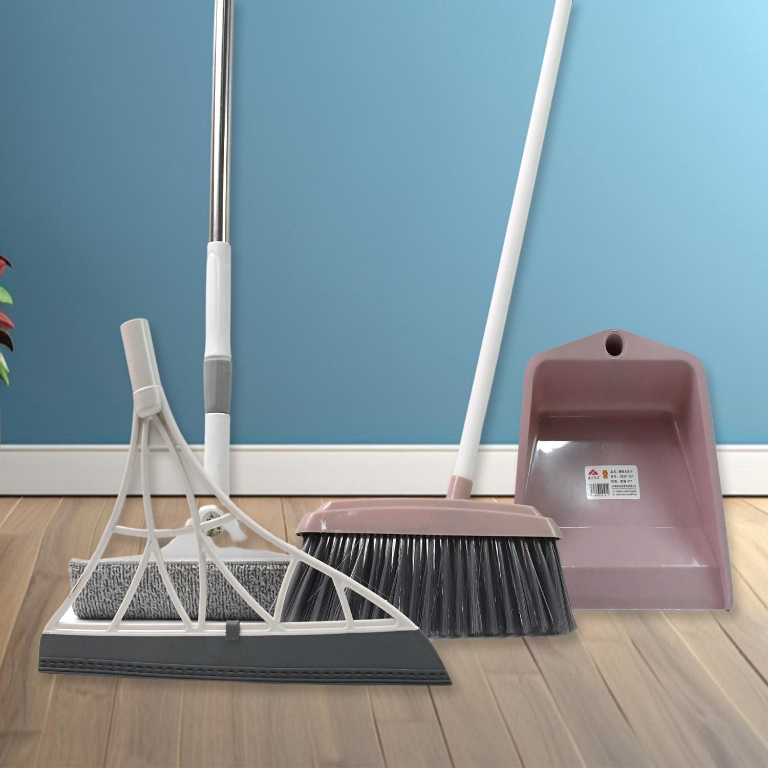 Heavy Duty Dustpan, Plastic Kitchen Wiper, 2 in 1 Adjustable Window Cleaning Squeegee Tool and Long Handle Broom Brush Combo (4 Pcs Combo)